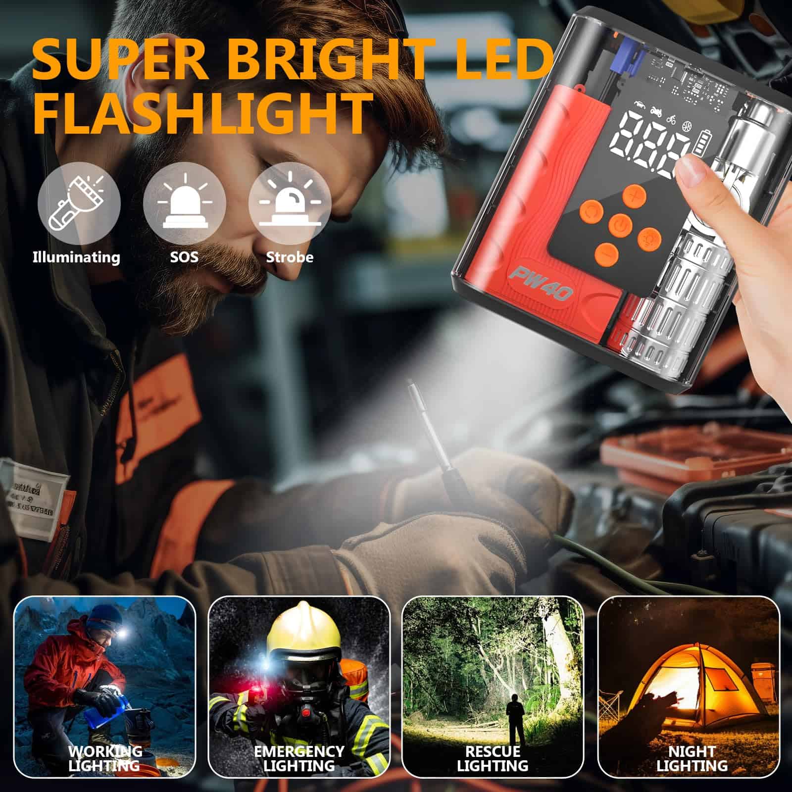 5. Linterna LED y Batería de Larga Duración: El arrancador de batería utiliza una linterna LED brillante con 3 modos: Luz Estroboscópica, Luz Estroboscópica y Luz SOS. Cuando no está en uso, este arrancador de batería para automóvil puede mantener la energía durante aproximadamente 24 meses, siempre listo para ayudarlo.