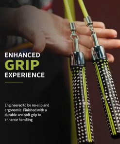 HEREROPE presenta su cuerda para saltar ponderada de 1/4LB diseñada para ofrecer un entrenamiento efectivo de velocidad, cardio, boxeo y fitness. Con un peso ligero en la cuerda, minimiza los enredos y permite al usuario desarrollar velocidad y habilidad. El recubrimiento exclusivo garantiza saltar de forma segura en cualquier superficie. Los rodamientos de bolas premium incorporados en el mecanismo de doble rotación proporcionan una potencia de rotación adicional y una experiencia de salto suave. El mango cómodo está diseñado con un agarre de cuero PU para mejorar la comodidad y el manejo durante el ejercicio. Además, la opción de longitud de cuerda permite a los usuarios ajustarla a su altura para un ajuste personalizado. Recomendamos a los principiantes elegir la cuerda más larga si se encuentran entre tallas. Ya sea que estés comenzando en el mundo del salt… (truncated)