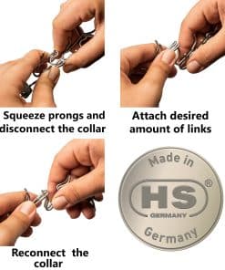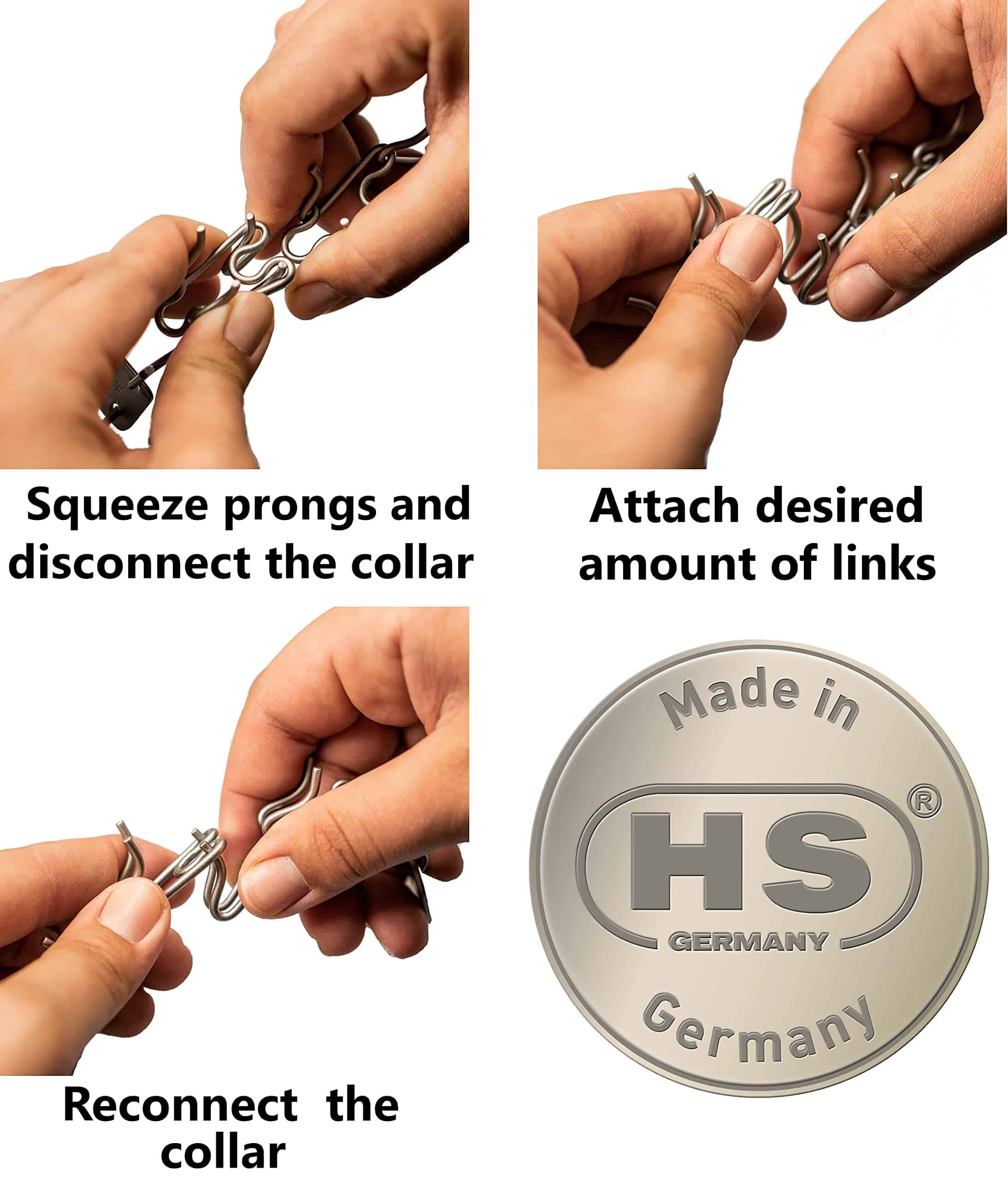 Set de 3 enlaces: Este set incluye 3 enlaces adicionales de acero inoxidable Herm Sprenger para agrandar el collar de pinchos original de tu perro con el calibre de alambre de 4.0 mm. Compatible con: Collar de adiestramiento Ultra – Plus con placa central y hebilla ClickLock; Collar de adiestramiento Ultra – Plus con placa central y cadena de ensamblaje. Ajuste del collar: Para ajustar la longitud del collar, coloca enlaces medios adicionales individuales para un ajuste personalizado al cuello de tu perro. Hecho en Alemania: Fabricado con precisión por ingeniería alemana, Sprenger ofrece confiabilidad y calidad del fabricante líder en collares de adiestramiento de alta calidad a nivel mundial.