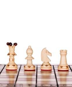 El tablero de ajedrez está hecho de madera de roble y contrachapado, horneado, teñido y barnizado. El interior está forrado con un inserto granate. Las piezas están hechas de madera de carpe, decoradas con un patrón quemado, pegadas con fieltro granate.