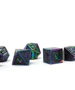Cada set de dados poliédricos de metal incluye siete de los dados poliédricos estándar para juegos de mesa. Incluido en este artículo hay un D20, un D10, un D8, un D6, un D4 y un D00 – que es un dado de diez caras para porcentajes. La Serie de Dados Metálicos de Brillo Metálico fue lanzada en Kickstarter, y ofrece un aspecto único a estos sets de dados de metal con borde.