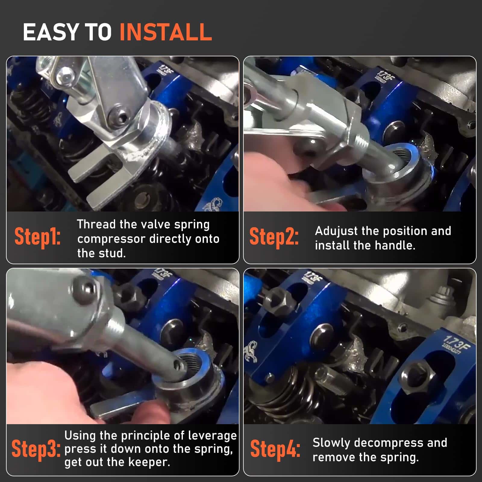 3. Fácil de usar: Al comprimir los muelles, mantén los muelles en una posición de bloqueo, y luego tendrás la mano libre para terminar la instalación del retenedor de válvula.
