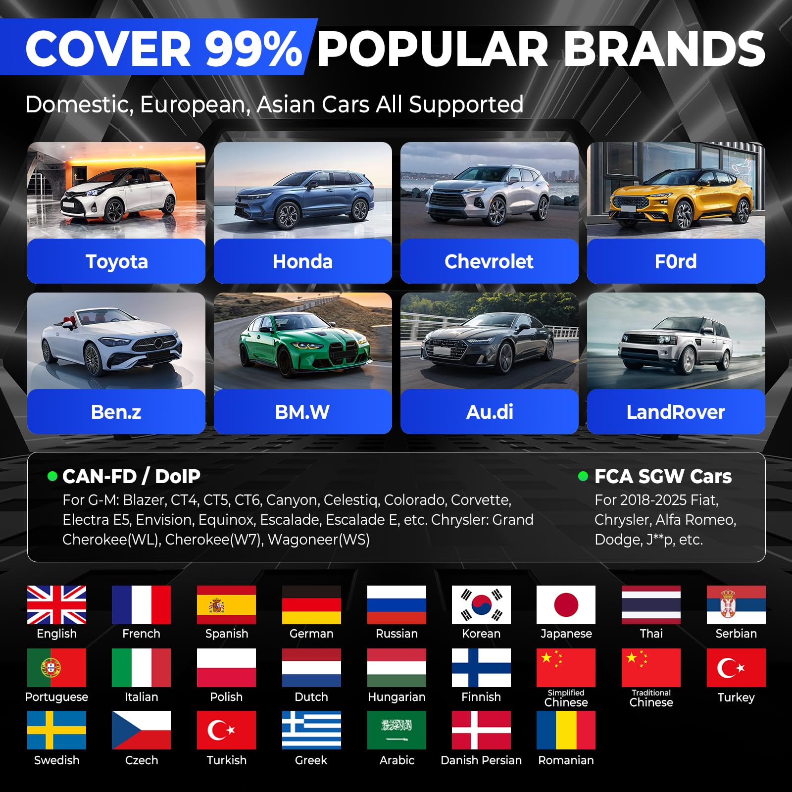 Universal All-In-One Tool LAUNCH PROS Elite trabaja con más del 99% de los vehículos OBD2/EOBD: 200,000+ autos de todo EE. UU/Europa/Asia, incluyendo más de 200 marcas de Buick, Cadillac, Chevy, Chrysler, Dodge, Honda, Ford, GM, J p, Lincoln, B.MW, V-W, VAZ, e incluso autos de lujo Porsche, Maserati y muchos más. Es una herramienta de escaneo bidireccional de todos los sistemas, también con codificación de ECU, 3000+ Pruebas Activas, 38+ Servicios con 25 menús de idiomas! Muy útil para la detección rápida de fallas.