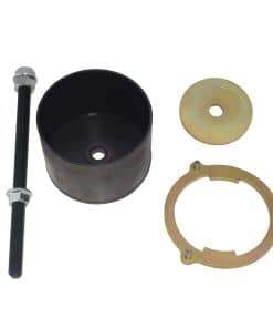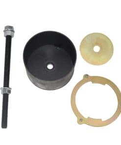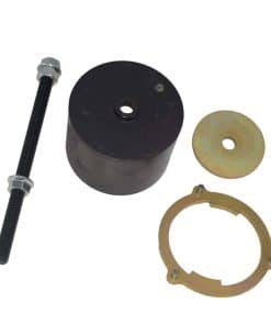 Función: Se utilizan para quitar los bujes de fábrica de las plataformas mencionadas. También sirve como herramienta de instalación para bujes OEM M3, bujes de delrin o bujes de aluminio sólido. Para quitar los bujes de fábrica, deberás bajar el subchasis pero no quitarlo por completo. Necesitas el acceso suficiente a la parte superior de los bujes para poner la placa de arandela y enroscar la tuerca y la contratuerca en la varilla roscada. Para quitar los bujes en la parte trasera del subchasis, debes usar la herramienta sin la arandela grande con lengüeta. Para los bujes en la parte delantera del subchasis, debes usar la arandela con lengüeta para atrapar el borde estrecho del subchasis que sostiene los bujes. Los bujes traseros son en general fáciles. Los bujes delanteros sin el uso de esta herramienta serían extremadamente difíciles, ya que no hay una verdadera área para empujar contra el subchasis, excepto los dos bordes estrechos del subchasis expuestos a través de muescas moldeadas en el buje. Una vez que los bujes se quitan, generalmente puedes instalar bujes de uretano divididos del mercado de accesorios a mano. Para instalar bujes M3, Delrin o de aluminio sólido, deberás quitar completamente el subchasis para permitir más espacio en la parte superior para usar la herramienta para volver a colocar los bujes.