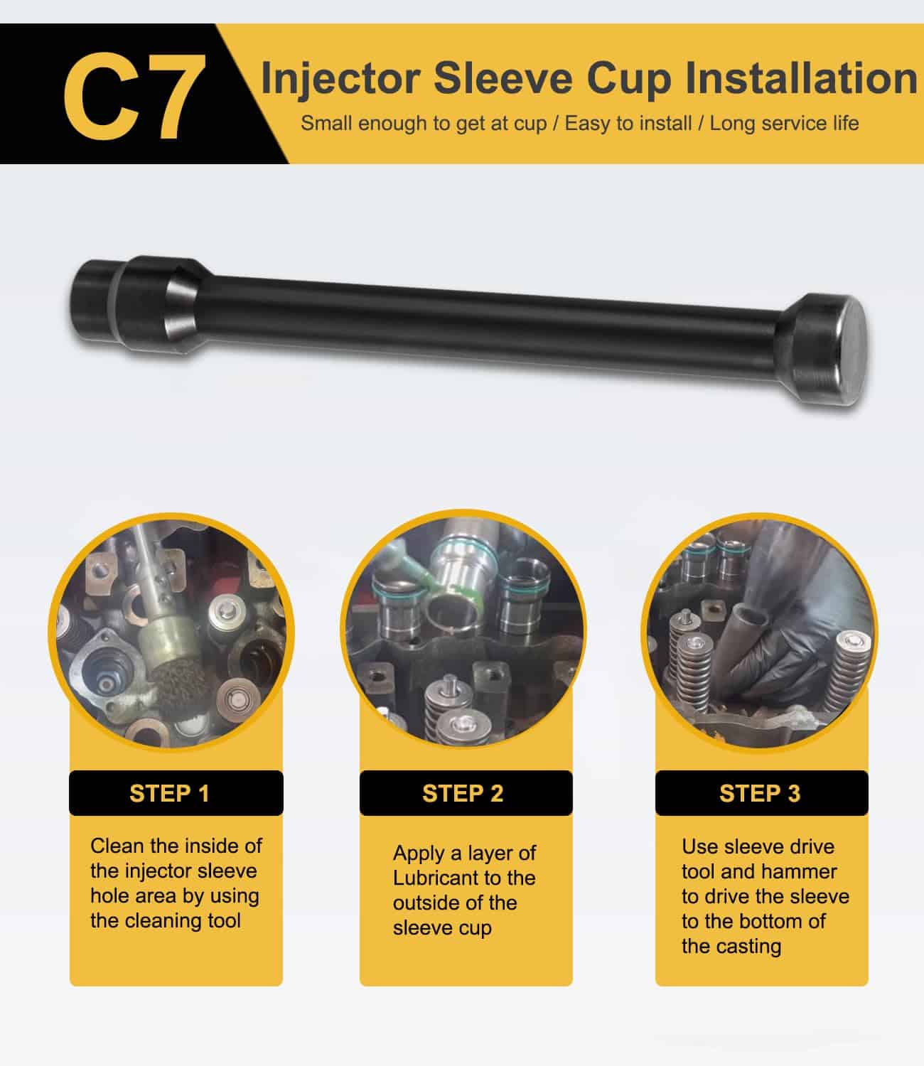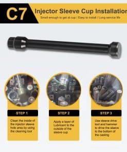 5. Diseño Elegante La herramienta de instalación y extracción de copa de manga de inyector C7 C9 con kit de piezas es lo suficientemente pequeña como para permitirle cambiar incluso las copas difíciles de alcanzar en la parte trasera del motor.