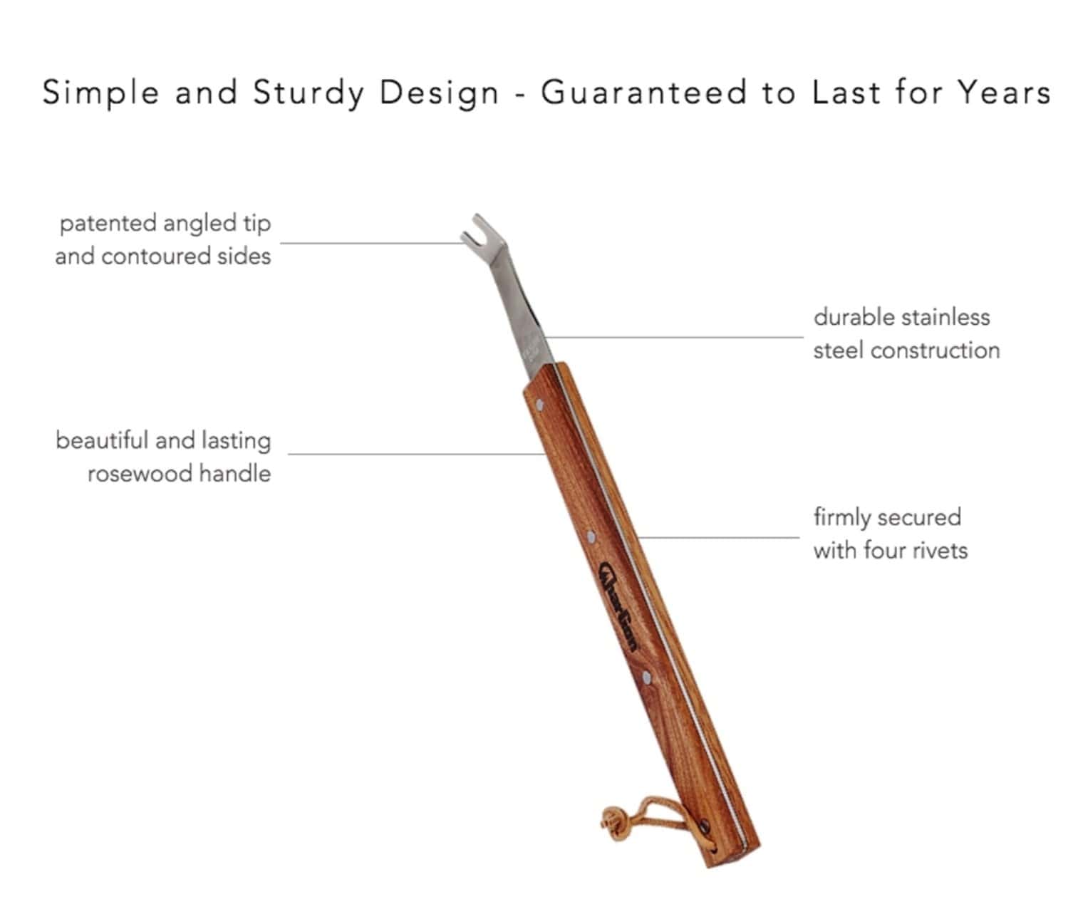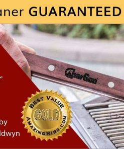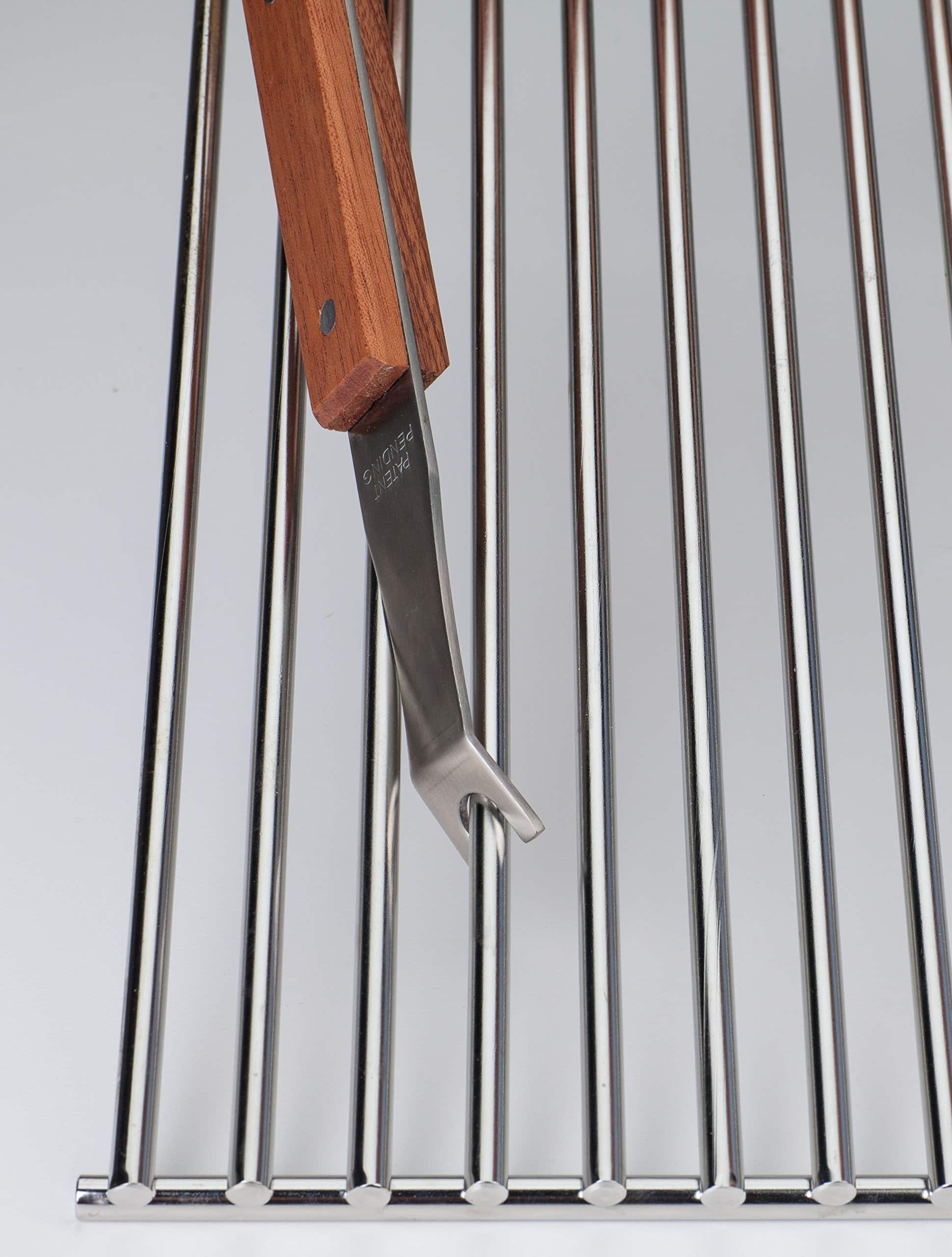Herramienta de limpieza CharGon BBQ de acero inoxidable para parrillas redondas ultima generación. Probado en rendimiento para 500 limpiezas, CharGon es el último producto de limpieza de parrillas que necesitarás comprar. Construido para durar años, CharGon está fabricado con el mejor acero inoxidable y un hermoso mango de palo de rosa firmemente asegurado con cuatro remaches. La punta angulada patentada y los lados contorneados permiten la limpieza segura de varillas de parrilla redondas calientes o frías. Simplemente deslízalo directamente sobre cualquier varilla de parrilla para limpiar la parte superior y los lados, luego gira 1/4 de vuelta para limpiar la parte inferior. Nunca vuelvas a contaminar tu comida con cerdas de alambre.