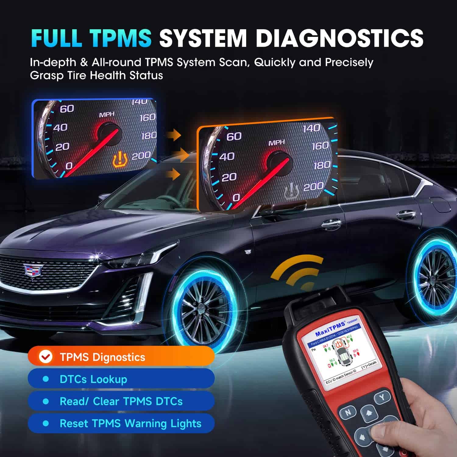 6. Diagnósticos y Servicios Completos de TPMS. Como la herramienta de diagnóstico y servicio TPMS de nueva generación para 2025, Autel TS508WF, la herramienta de reinicio de TPMS, puede activar inalámbricamente el 99% de los sensores de TPMS en el mercado y permitirle recuperar rápidamente y con precisión los datos del sensor TPMS como ID del sensor, presión de neumáticos, temperatura de neumáticos, batería del sensor, posición del sensor, frecuencia, etc. Además, TPMS TS508WF puede leer, borrar los DTC de TPMS y restablecer las luces de advertencia de TPMS, lo que le ayuda a resolver el 99,9% de los problemas de TPMS. ¡Vale la pena cada centavo!