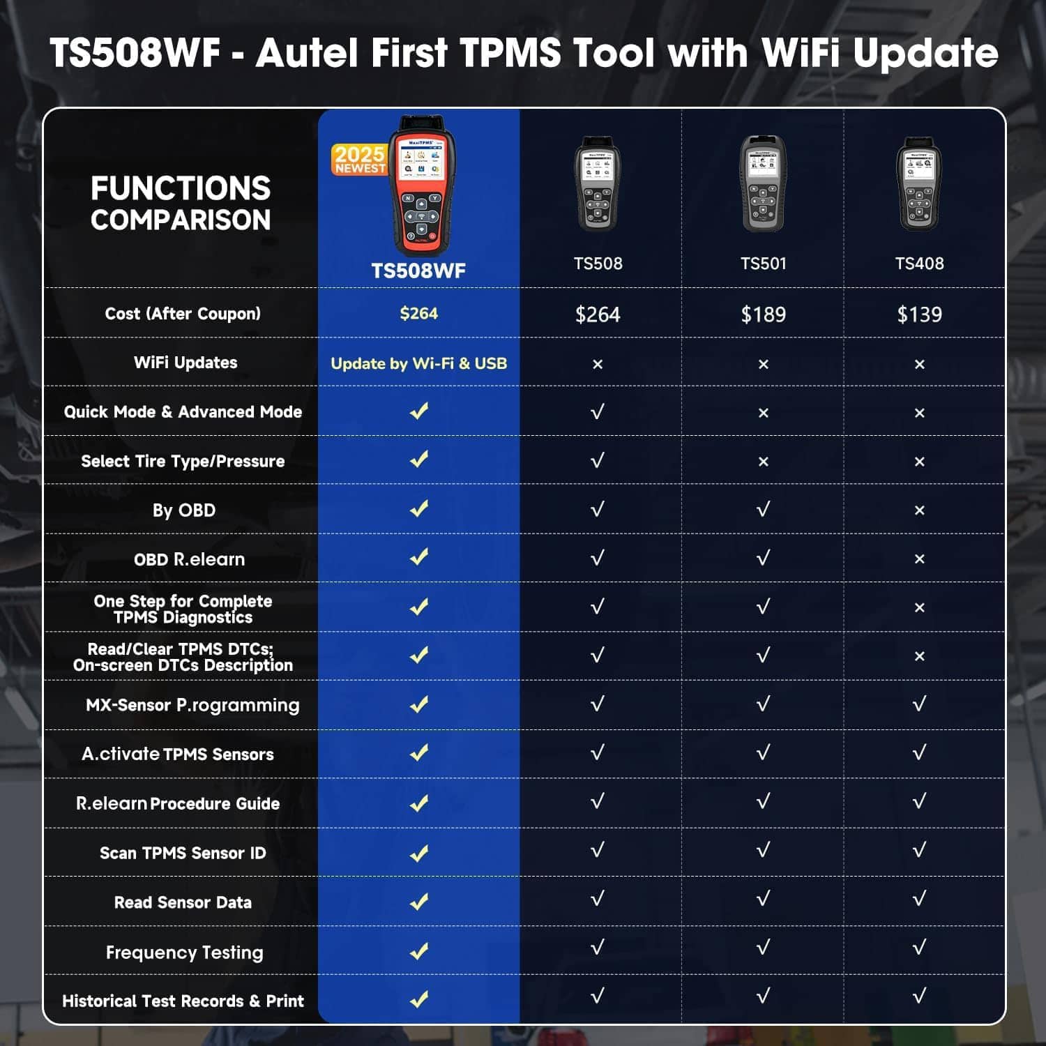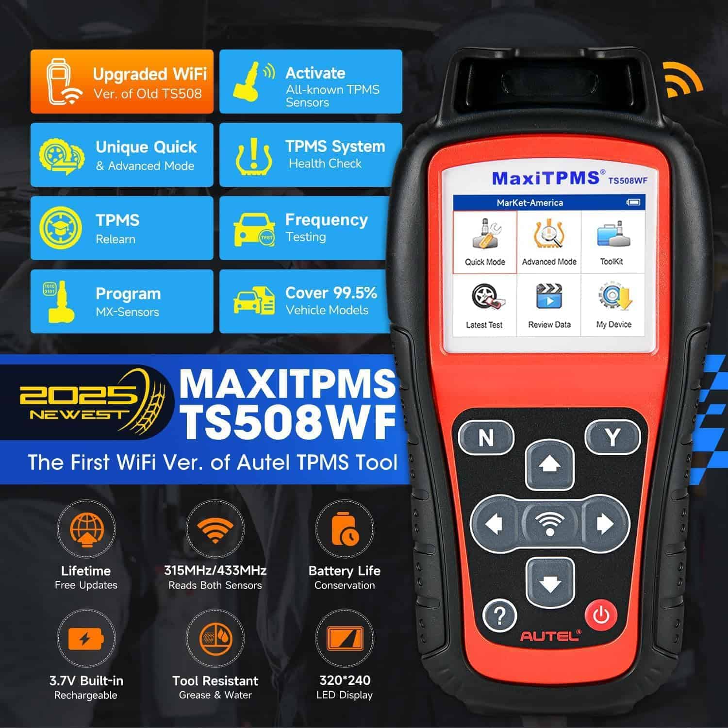 1. ¡Buena noticia! El escáner de TPMS Autel TS508WF, la primera herramienta no-tableta de Autel que proporciona actualizaciones de por vida a través de WiFi, está disponible. Puede actualizarlo directamente en un entorno WiFi, no es necesario un ordenador. Autel TS508WF, herramienta de programación que incorpora todas las características de TS508/TS501/TS408/TS601, satisface todas sus necesidades con funciones poderosas como el relearn de TPMS, programación, activación y diagnósticos relacionados con TPMS a través de OBD2. Superior a los competidores, TS508WF puede diagnosticar los últimos modelos y actualizarse a un ritmo increíble que le permite disfrutar de más funciones.