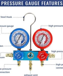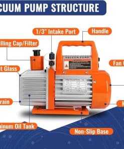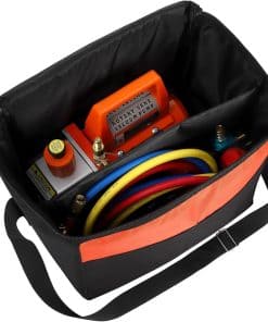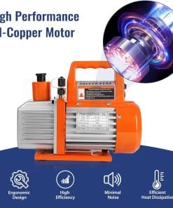 Herramientas de Reparación de Línea de Aire Acondicionado (3.5cfm 1/4hp) – Nuestra bomba de vacío cuenta con una carcasa de aleación de aluminio fundido, lo que la hace ligera y resistente. Equipada con tapones de seguridad con cadena de latón, garantiza que no haya fugas de aceite durante el transporte. Experimenta una operación eficiente y silenciosa con nuestra bomba de vacío de aire rotativa de una sola etapa de 110V 1/4HP 3.5CFM, con una construcción sólida de motor para un servicio confiable. El caudal de 4.0 cfm y el diseño rotativo de una etapa eliminan eficazmente la humedad y el aire, asegurando que tu sistema funcione perfectamente. Nuestro juego de manómetros de servicio es ideal para diagnosticar y reparar sistemas de AC, adecuado para sistemas R32, R134a, R12, R22, R502 y R410a. Los manómetros de presión coloridos de alta calidad ofrecen lecturas precisas cada vez. Opera en paz con la construcción sólida de nuestra bomba de vacío que garantiza una operación suave y silenciosa. Perfecto para uso residencial o comercial, elimina la humedad y el aire de los sistemas sin interrupciones de ruido. Con un visor de aceite, vigila fácilmente tu nivel y calidad de aceite. La válvula de drenaje del aceite permite cambios rápidos y completos de aceite, garantizando que tu bomba funcione a máxima eficiencia. El kit incluye mangueras de goma con un diseño de sellado hermético, duraderas y flexibles para un uso fácil. Las mangueras codificadas por color (rojo para alta presión, azul para baja presión, amarillo para llenado) y los adaptadores para R410a mejoran la usabilidad, asegurando un ajuste perfecto para diversas aplicaciones. Nuestro kit incluye todo lo que necesitas para recargar sistemas de HVAC, aire acondicionado y refrigeración: una bomba de vacío, una botella de aceite de vacío de 0.35qt./330ml, un detector de fugas y un juego de manómetros de AC R32 R134a, todo convenientemente empaquetado en una bolsa de transporte. Certificado ETL para seguridad y confiabilidad.