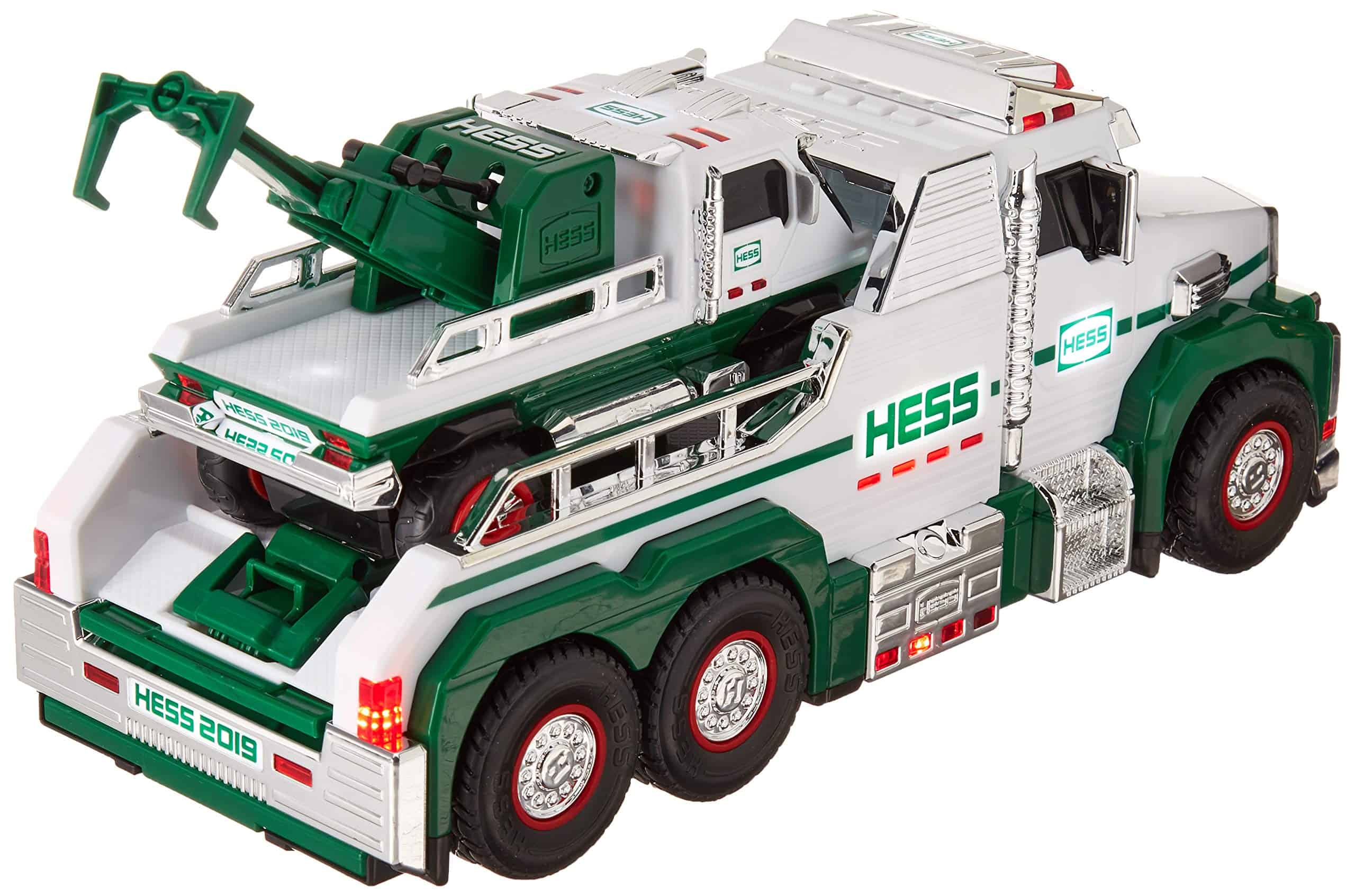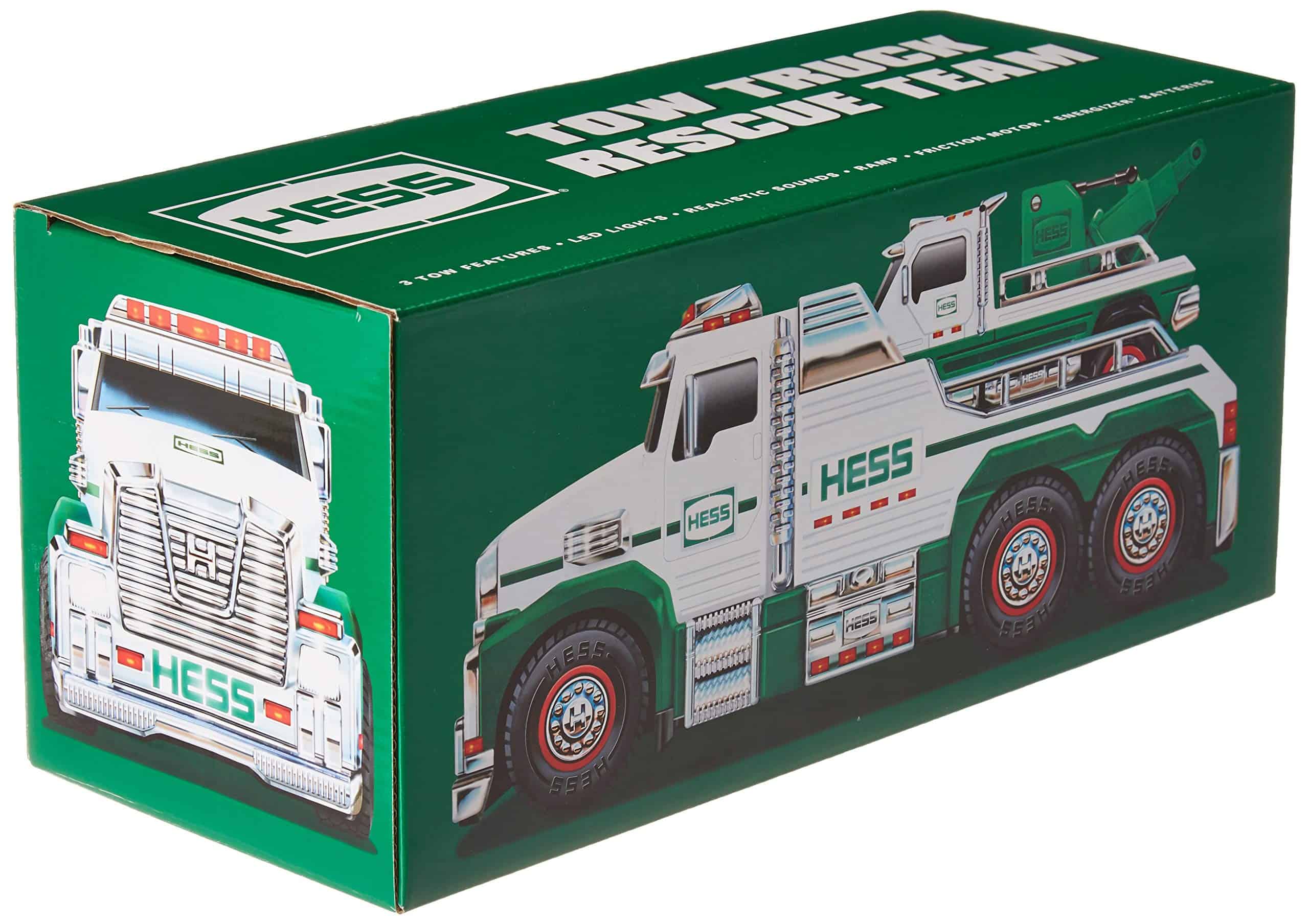 El Equipo de Rescate de Camiones de Remolque Hess 2019 es un potente par de vehículos de asistencia en carretera, llenos de características: triple acción de remolque, 4 sonidos realistas, más de 60 brillantes luces LED, y un rápido motor de fricción. Este juguete único de Hess está diseñado para un juego imaginario infinito y una versatilidad inigualable que manejará los desafíos de remolque más difíciles. Hess 2019 Equipo de Rescate de Camiones de Remolque 3 Características de Remolque Luces LED Sonidos Realistas Rampa Motor de Fricción
