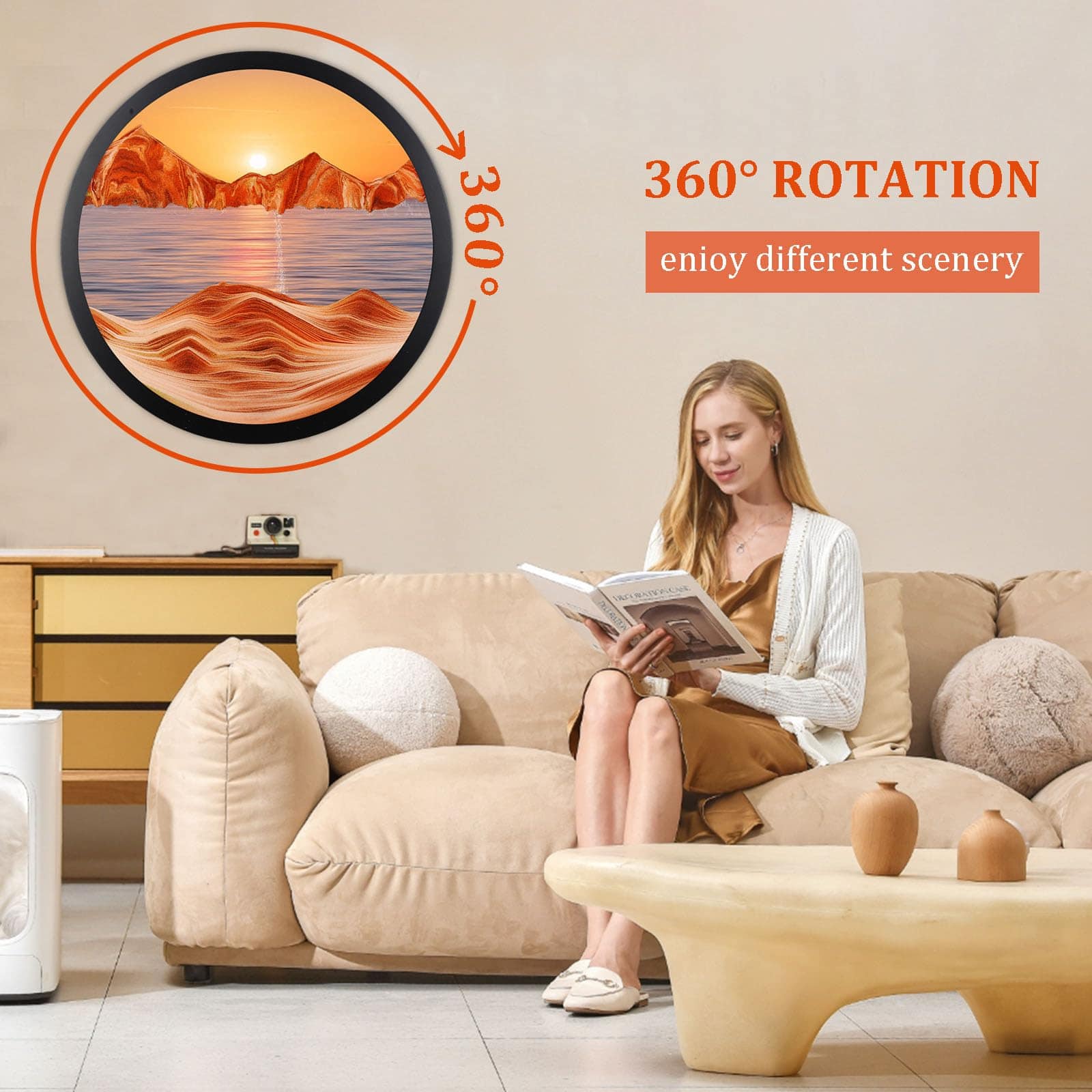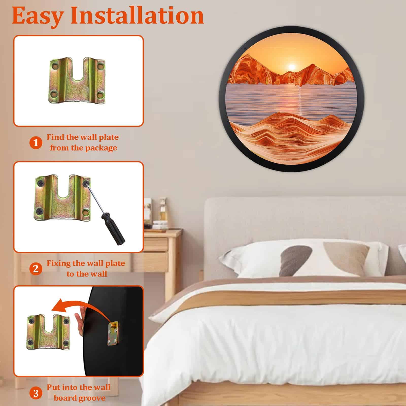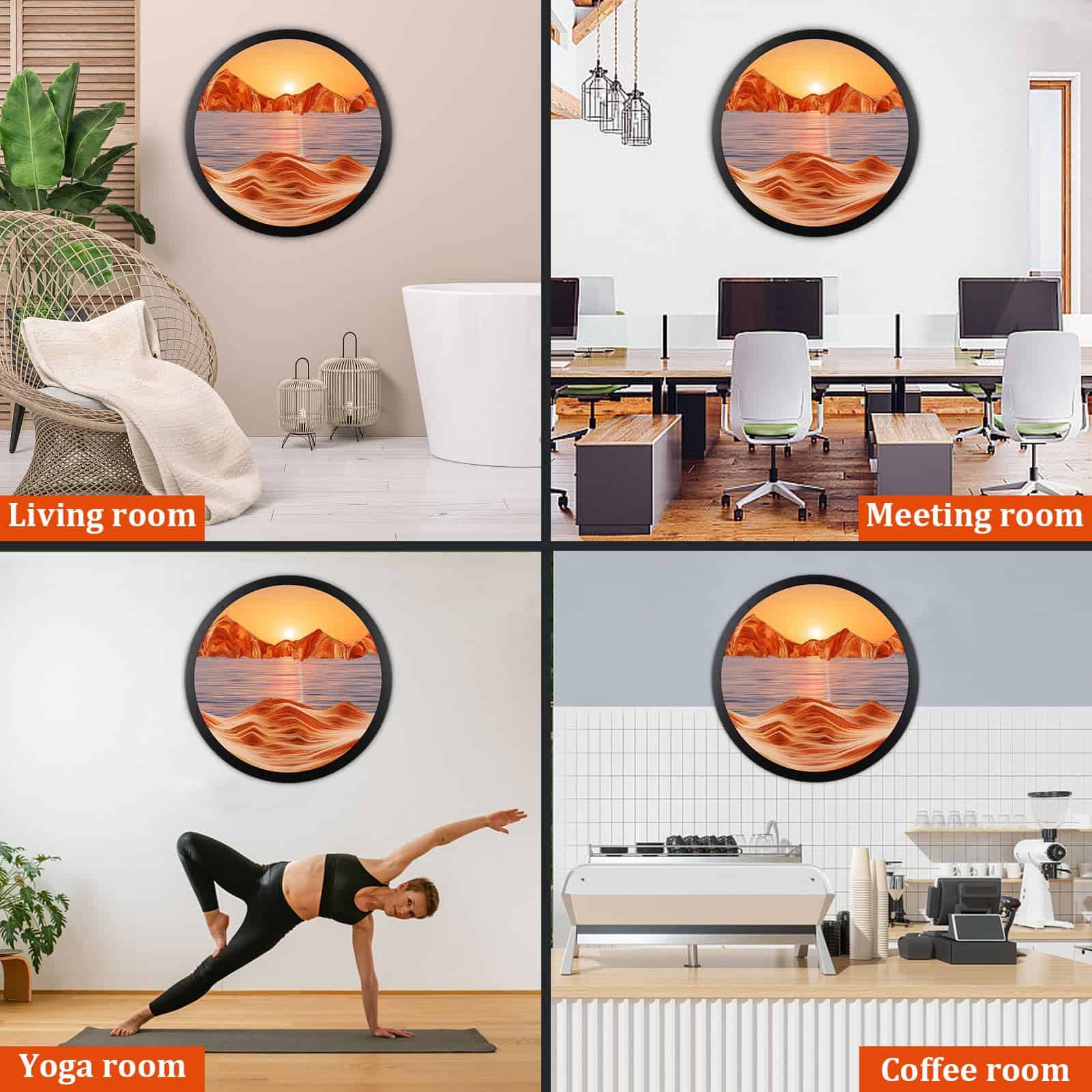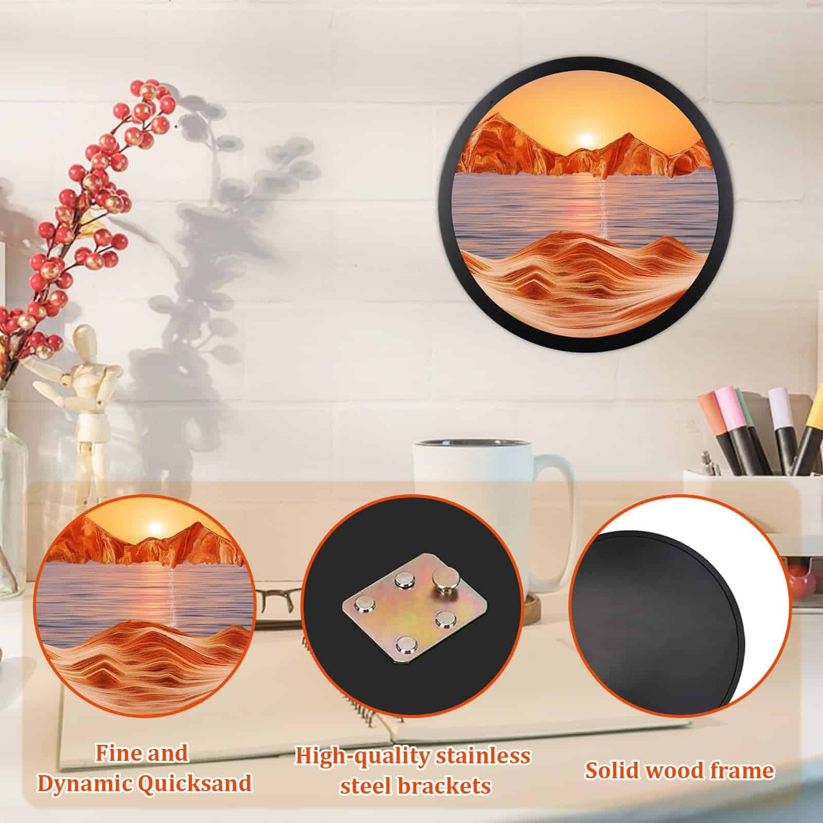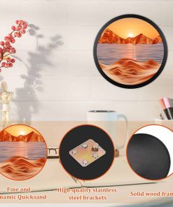 1. Diseño único El exquisito arte líquido en movimiento de arena adopta el diseño de arte dinámico de paisaje natural en 3D y también puede rotar 360 grados. Cada rotación mostrará un paisaje diferente, lo que nos puede traer una sensación única y una hermosa experiencia. 2. Aliviar el estrés El hermoso arte de arena en la pared es un adorno reconfortante. La arena que fluye lentamente y el paisaje siempre cambiante pueden ayudarnos a aliviar el estrés, liberar emociones y promover el desarrollo de la capacidad de pensamiento. 3. Material de alta calidad Nuestro arte de arena en movimiento está hecho de arena natural de alta calidad, de textura fina, ricamente coloreada y en capas, el marco está hecho de vidrio libre de plomo, altamente transparente y madera maciza de alta calidad, lo que nos permita disfrutar plenamente de la belleza del caleidoscopio. 4. Fácil de instalar La imagen en movimiento de arena de 17.3″ viene con ganchos en la parte trasera, fácil de instalar y operar. Simplemente haga agujeros en la pared, fije el soporte de arte de arena y puede colgar el producto directamente. 5. Amplio uso La imagen de arte de arena en movimiento no solo puede decorar su hogar u oficina para crear un ambiente de alta gama para su espacio. Al mismo tiempo, también es un regalo perfecto, perfecto para padres, amantes, niños y amigos, bríndeles una experiencia inusual.