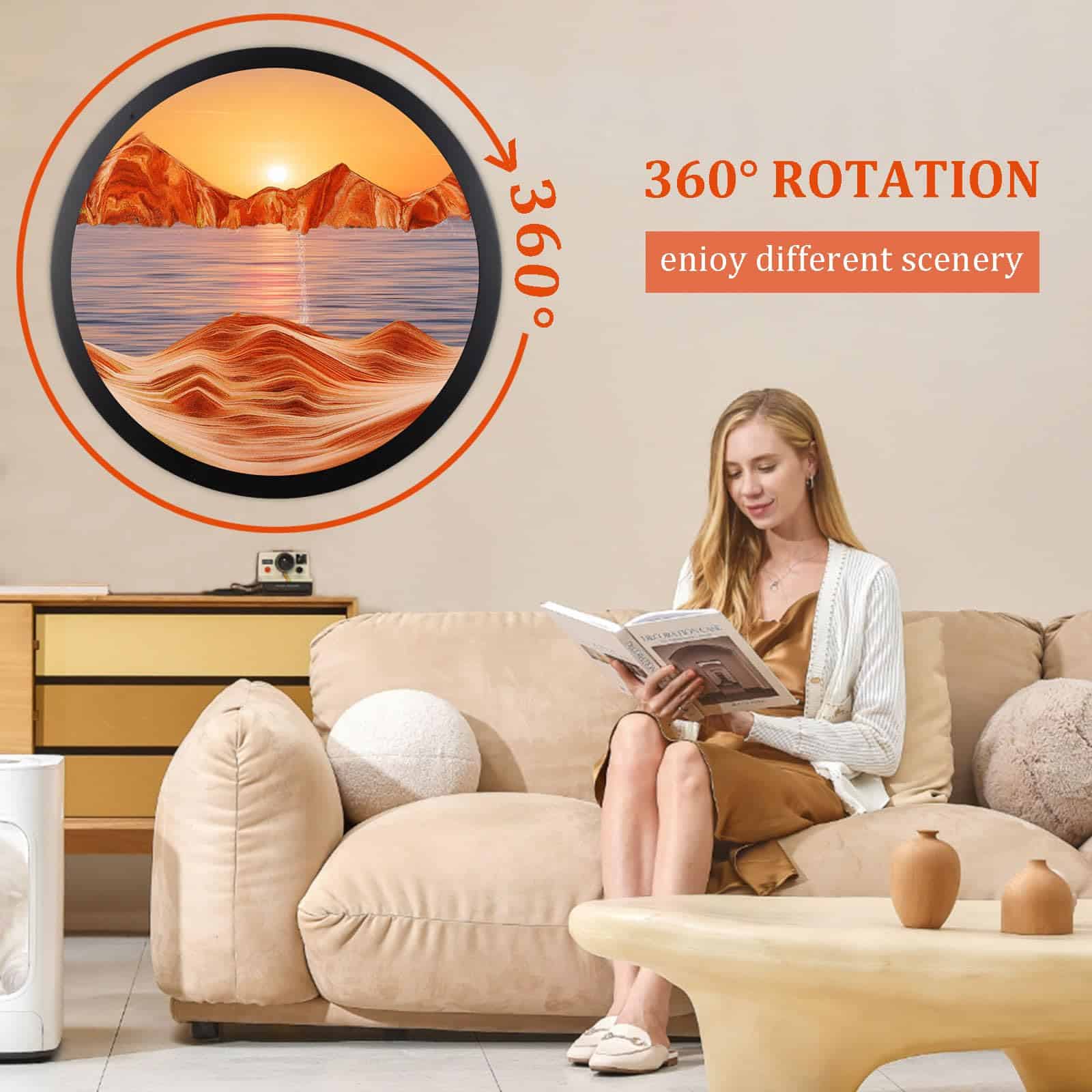 1. Ventajas del producto Nuestro arte de arena en movimiento está hecho de vidrio de alta calidad, marco de madera maciza y arena cuidadosamente seleccionada, que es a prueba de herrumbre y duradero. Además, el exquisito movimiento líquido del arte de arena también adopta el diseño de arte dinámico de paisajes naturales en 3D, y también puede rotar 360�. Cada rotación es un paisaje diferente, lo que te permite disfrutar plenamente de la belleza de la arena movediza!.