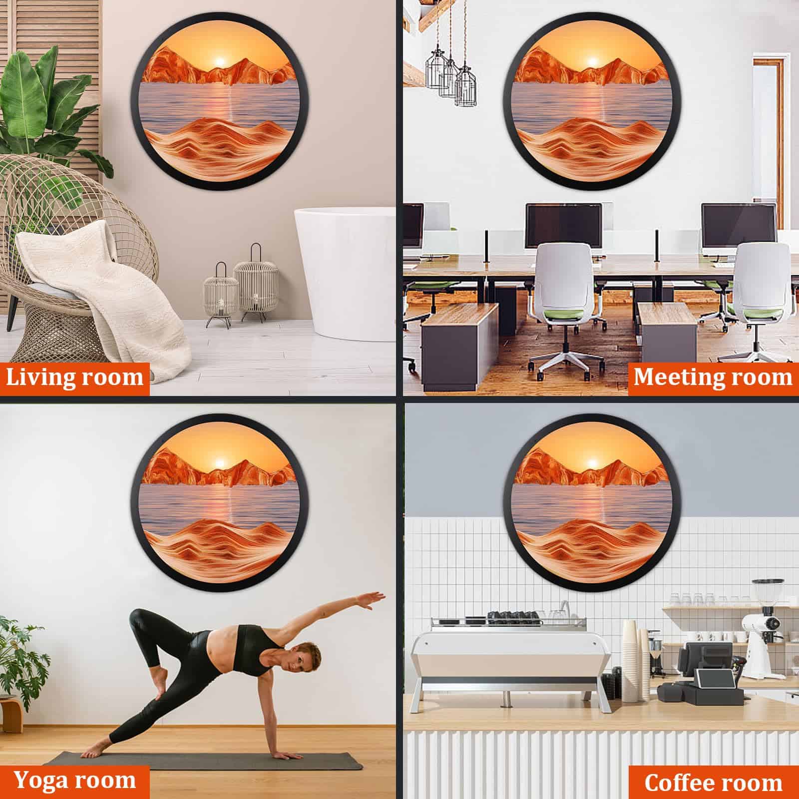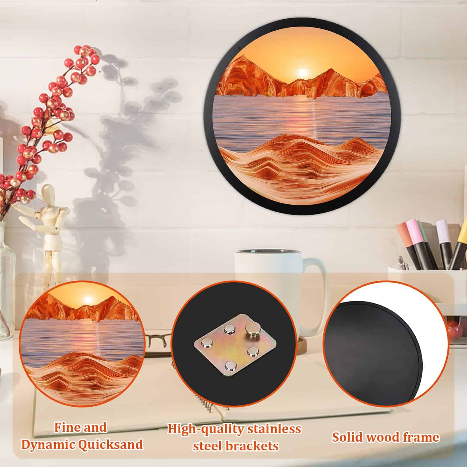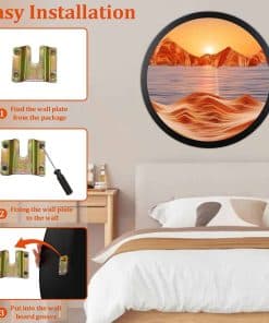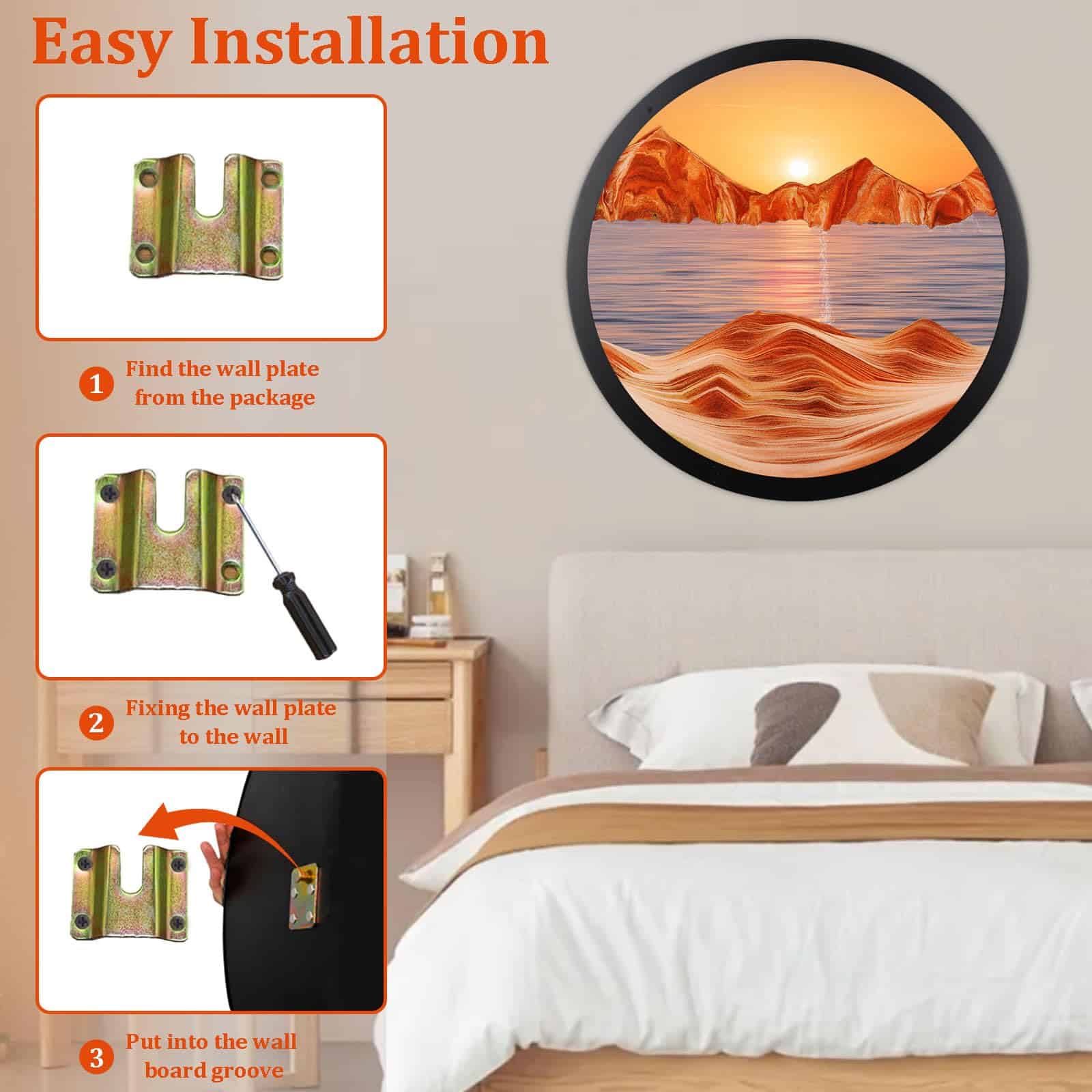 3. Fácil de instalar El arte de arena montado en la pared de la escultura de rotación viene con ganchos en la parte posterior, fácil de instalar y operar. Simplemente haz agujeros en la pared, fija el soporte de arte de arena y podrás colgar el producto directamente.