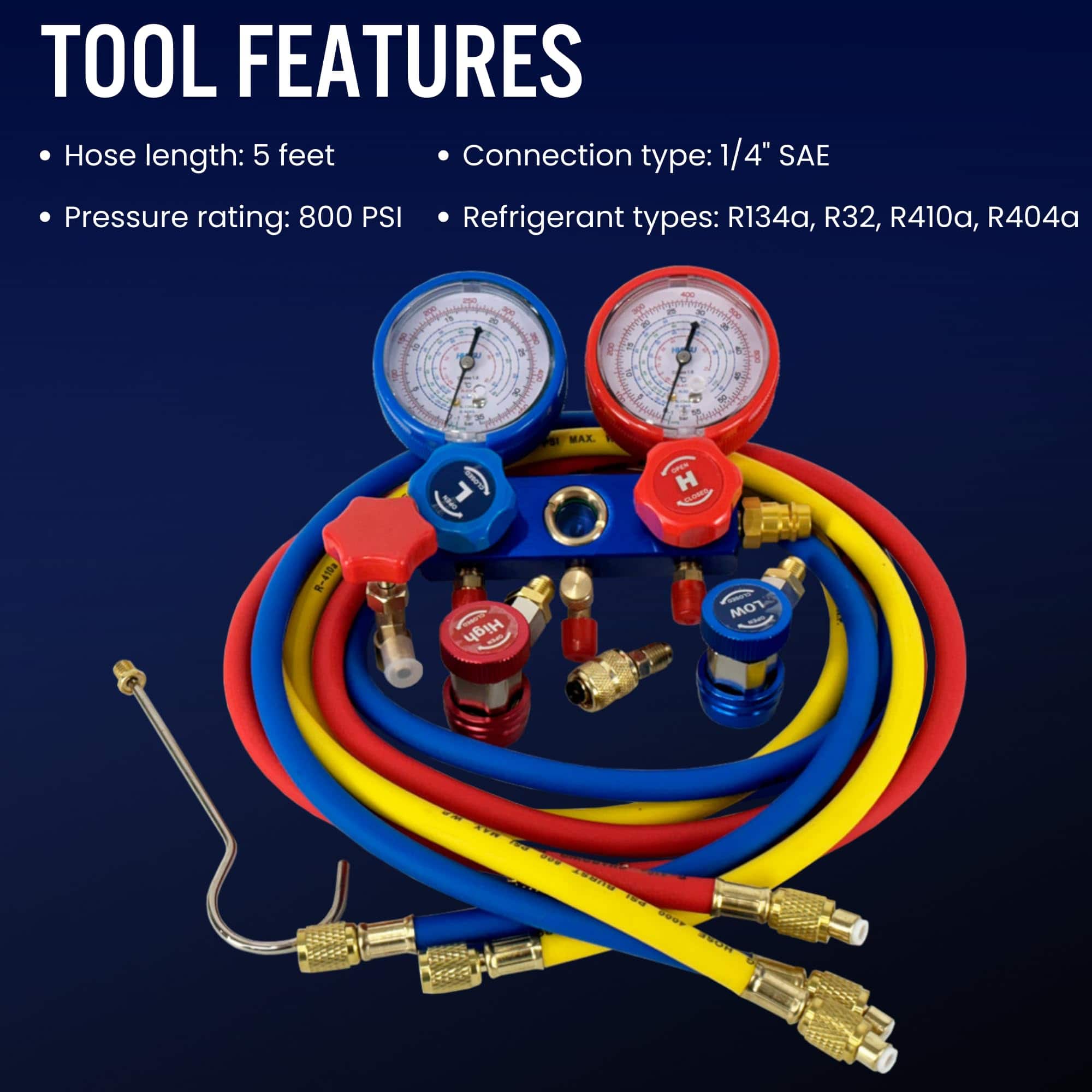 Complete package: Comprehensive AC recharge kit includes quick couplers, can tap valve, and universal adapter. The Automotive gauge set ensures compatibility with R134a, R32, R410a, and R404a refrigerants. Professional quality: Durable AC gauges constructed from high-grade brass with anti-shock protection. The freon gauges feature clear, easy-to-read displays with color-coded pressure readings for accurate diagnostics. Universal compatibility: Premium HVAC gauges designed for both automotive and residential applications. The AC adapter system includes all necessary fittings for various refrigerant types. Enhanced features: Automotive AC gauges kit includes self-sealing can tap and AC compressor kit components. The HVAC manifold gauge sets come with a professional storage case for protection and organization.