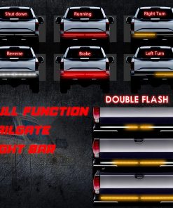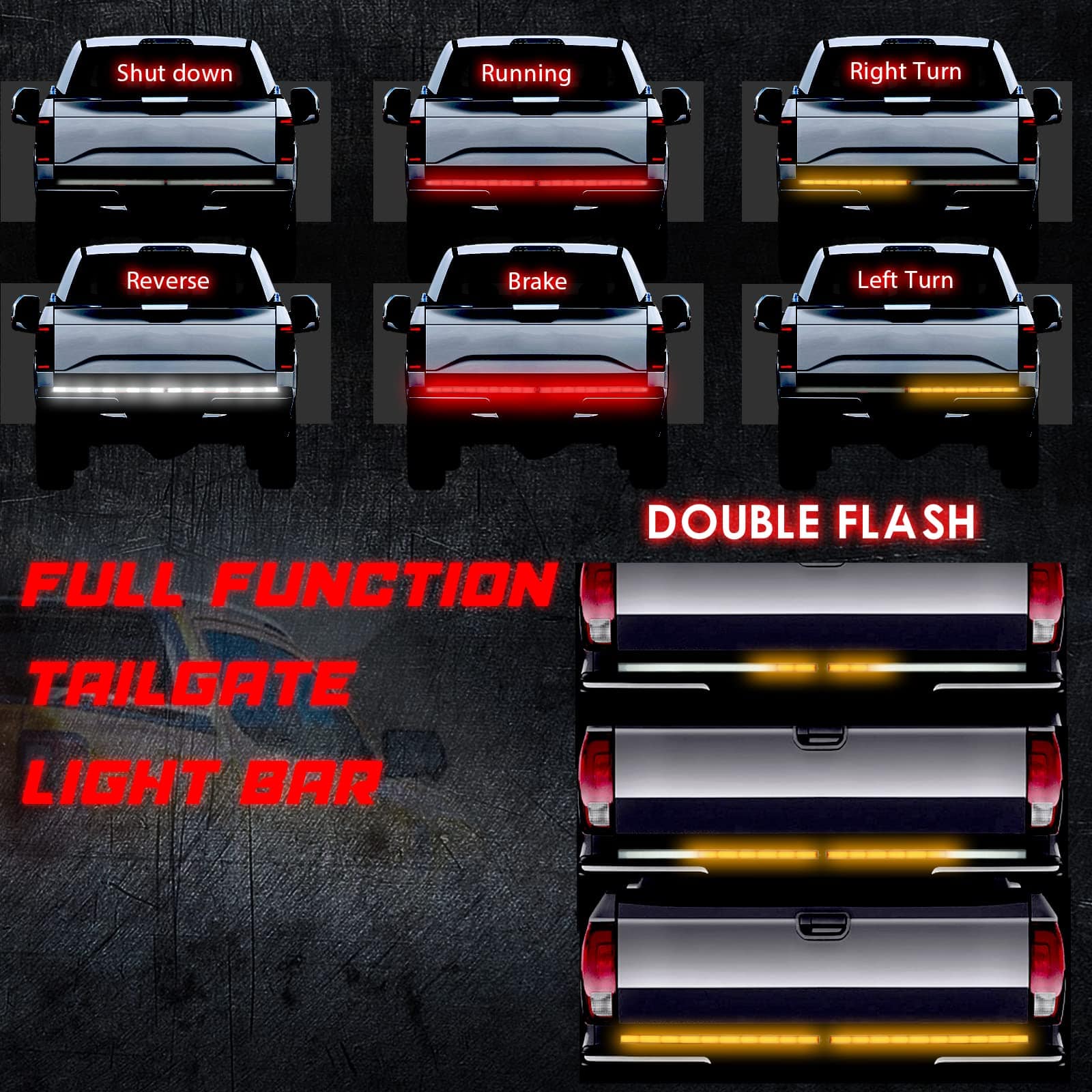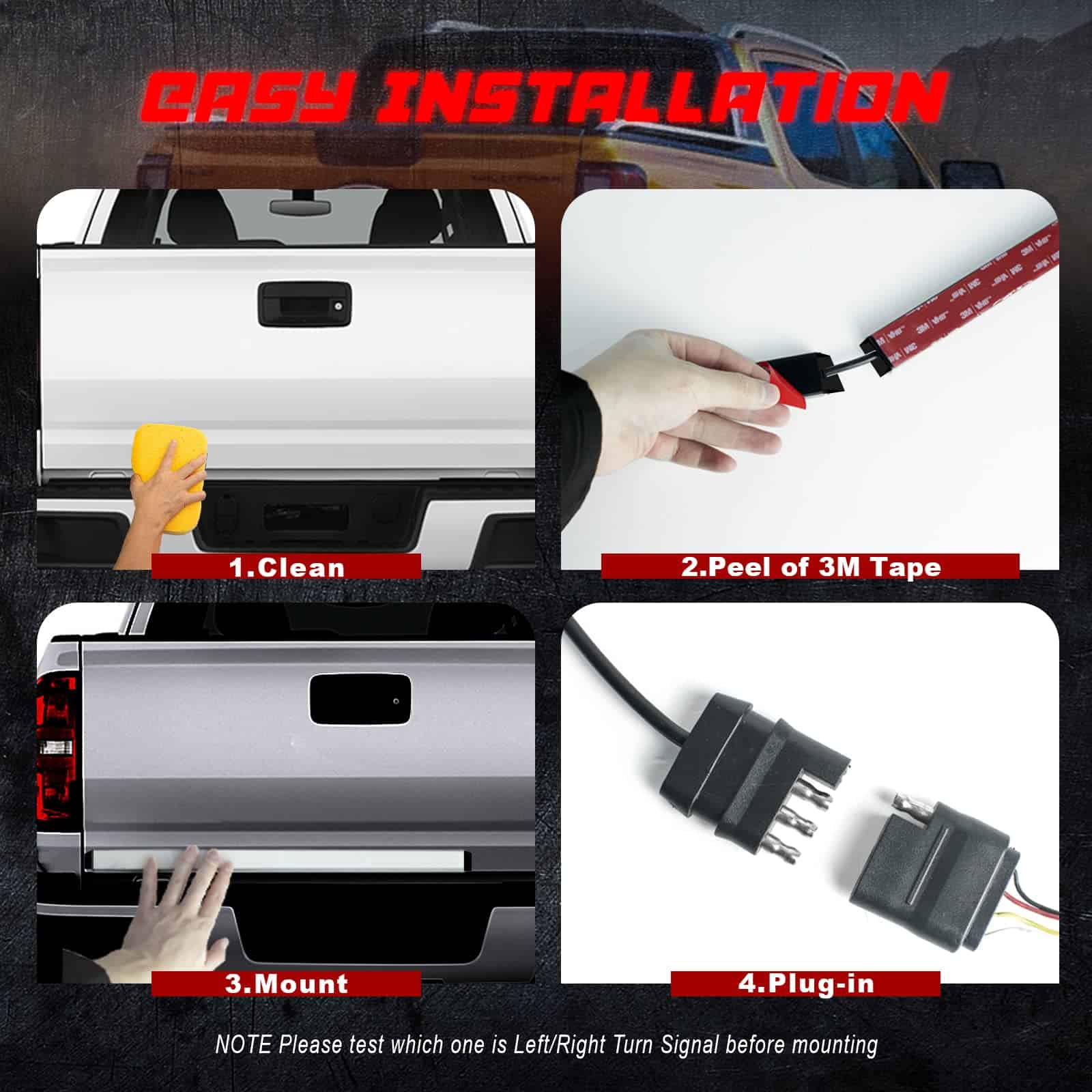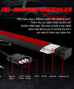 3. LLAMA LA ATENCIÓN Con funciones completas de luz de frenado, luz de giro izquierda, luz de giro derecha, luz de marcha, luz de marcha atrás y luz estroboscópica. La barra de luz para la portón trasero para camioneta emite un bajo Rojo para la marcha, Rojo brillante para el frenado, Ámbar para las señales de giro izquierda/derecha, Blanco para la marcha atrás, y Ámbar intermitente para la luz estroboscópica de emergencia. Deje que todos detrás de usted sepan claramente cuál será su próximo paso.