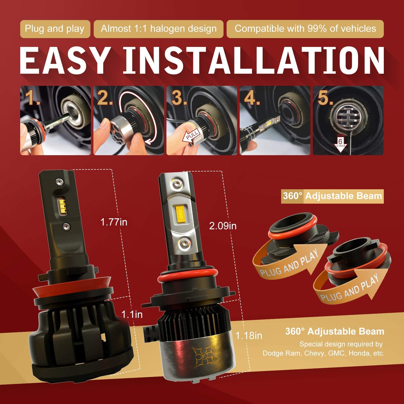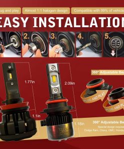 4. DISEÑO AVANZADO Instalación fácil: Plug and play, diseño casi 1:1 de halógeno, compatible con el 99% de los vehículos. Haz ajustable de 360 grados: Diseño especial requerido por Dodge Ram, Chevy, GMC, Honda, etc. Impermeable IP67, pasó la prueba de alta temperatura de 300 -7 días.