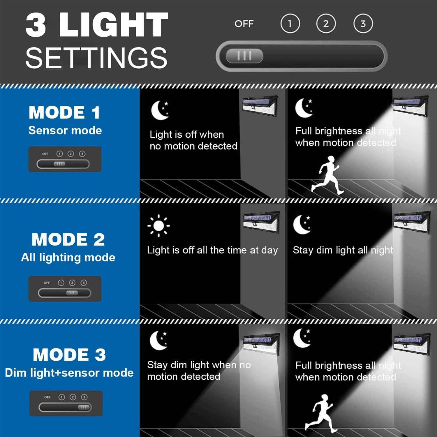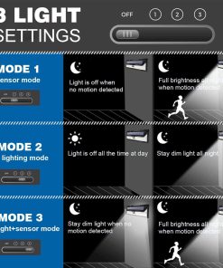 Además, los diferentes modos de iluminación y el control remoto permiten una mayor personalización y comodidad. El detector de movimiento PIR actualizado cubre hasta 16 pies con un ángulo de 120 grados y ofrece tres modos de iluminación para adaptarse a diversas necesidades: modo de permanencia, modo de luz tenue y modo de sensibilidad a la luz fuerte. El control remoto facilita el cambio de modos y la temporización del sensor.