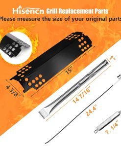 3. Materiales y dimensiones del producto – Dimensiones del quemador: 14 7/16″ x 1″, Material: Acero inoxidable, Número de modelo original: G432-Y700-W1, G432Y700W1. Dimensiones de la placa caliente: 15″ x 4 3/8″, Material: Acero porcelanizado, Número de modelo original: G432-0096-W1. Tienda caliente para la parrilla de gas Charbroil 463436215. Dimensiones del tubo transportador: 7 1/4″, Material: Acero inoxidable. Por favor, verifique las dimensiones y el modelo de su parrilla antes de realizar el pedido.