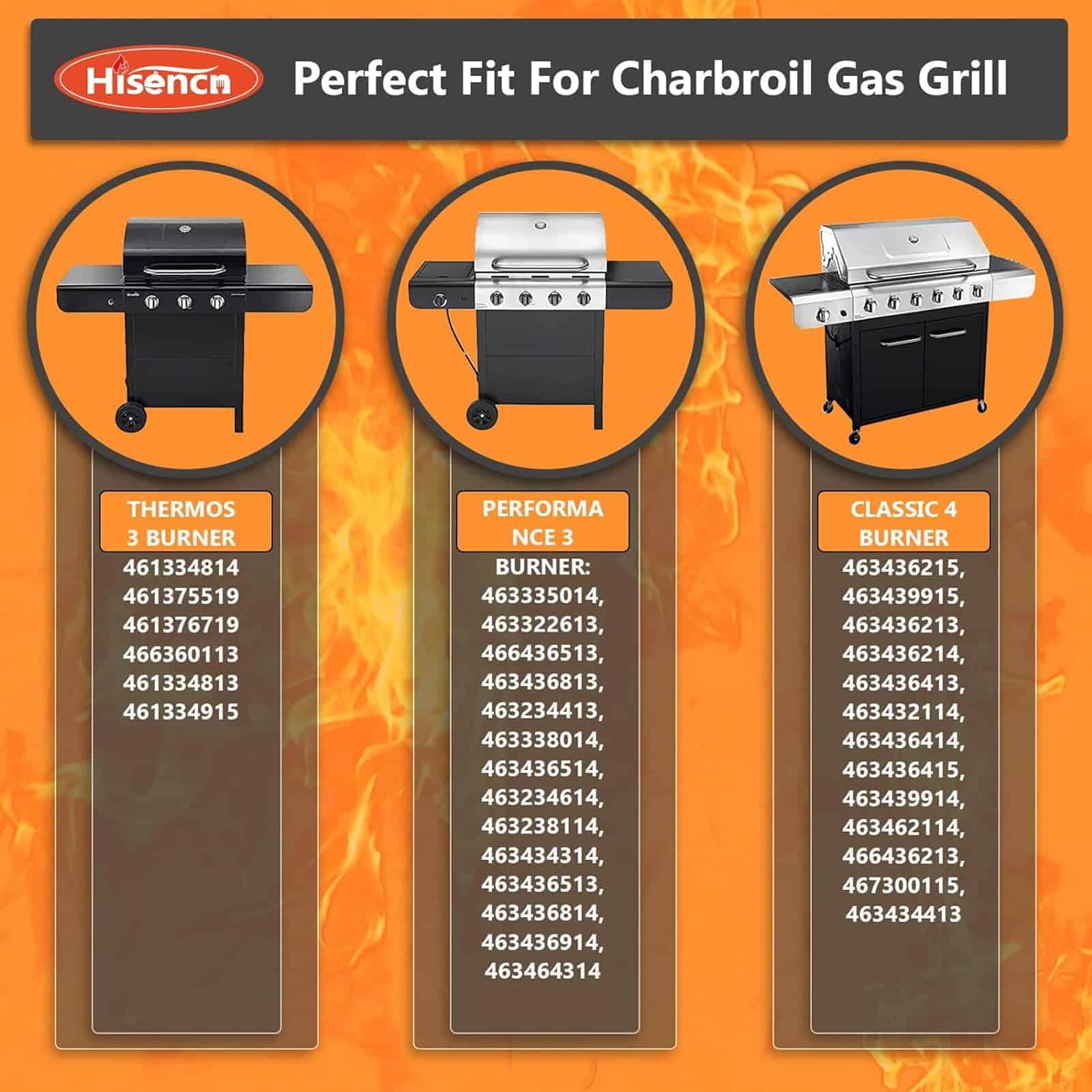 2. También se ajusta a las parrillas Charbroil Performance de 3 quemadores – Las partes de la parrilla se ajustan a Charbroil 461334813, 466436513, 463322613, 463436813, 463234413, 463335014, 463338014, 463436514, 463234614, 463238114, 463436513; Se ajusta a la parrilla de gas infrarroja Charbroil 463464314; Se ajusta a las parrillas Charbroil Performance TRU infrarrojo 463436814, 463436914; Se ajusta a las parrillas de gas Thermos 3 quemadores 461375519, 461376719, 466360113, 461334813, 461334814, 461334915, 461372517.