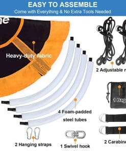 El columpio redondo Hishine de 43″ para niños es una excelente opción para proporcionar diversión al aire libre a todos. Su marco de acero circular resistente y su asiento de tela Textilene duradero lo convierten en un columpio seguro y confiable para que los niños y adultos se diviertan juntos. Con una capacidad de hasta 220 libras, este columpio es ideal para disfrutarlo en el patio trasero, jardín, patio de recreo, juego de columpios, árbol o sala de juegos. Las cuerdas ajustables y las correas de colgar permiten personalizar la altura del columpio, y el giro de 360 � brinda la emoción adicional de volar alto y disfrutar de la diversión de la rotación. Ensamblar el columpio es rápido y sencillo siguiendo las instrucciones detalladas proporcionadas. Disfruta del columpio redondo Hishine y crea momentos inolvidables con tus seres queridos.