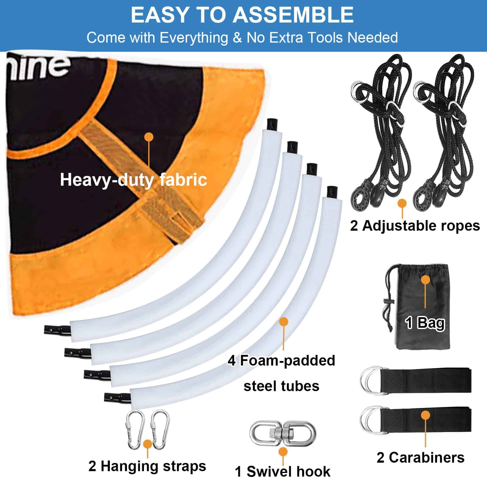 4. INSTALACIÓN FÁCIL Y CONEXIÓN SEGURA – Sigue las instrucciones detalladas que proporcionamos, el columpio estará completamente ensamblado en 5 minutos. En lugar de pernos y tuercas, utilizamos botones de clip de metal y conectores de plástico resistente para unir las partes del columpio, haciendo el montaje más sencillo y seguro. Los conectores de plástico están integrados al final de las cuerdas, sin más preocupaciones por el óxido del hardware, caídas o el columpio desmoronándose.