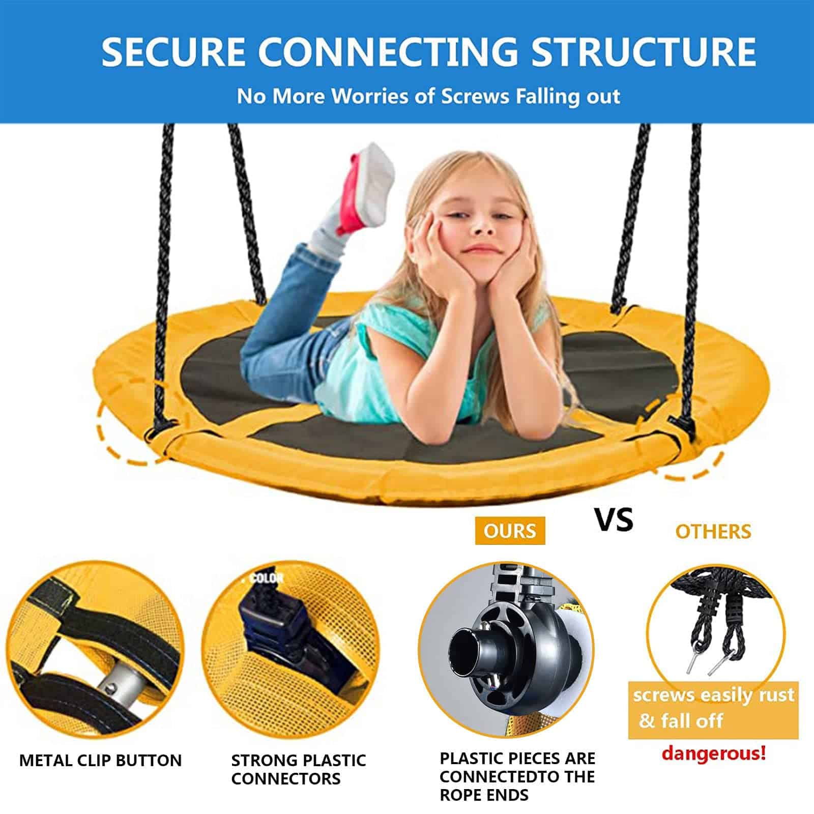 1. ESTRUCTURA DE ACERO CIRCULAR RESISTENTE – Amplio marco de acero resistente de 43 pulgadas con asiento de tela de Textilene de calidad se ajusta para 3 niños o 2 adultos. Soporta hasta 220 libras, más seguro para que los niños se columpien al aire libre durante mucho tiempo. El marco de acero galvanizado es resistente al óxido y a la intemperie, acolchado con espuma para garantizar tu seguridad, comodidad y placer.