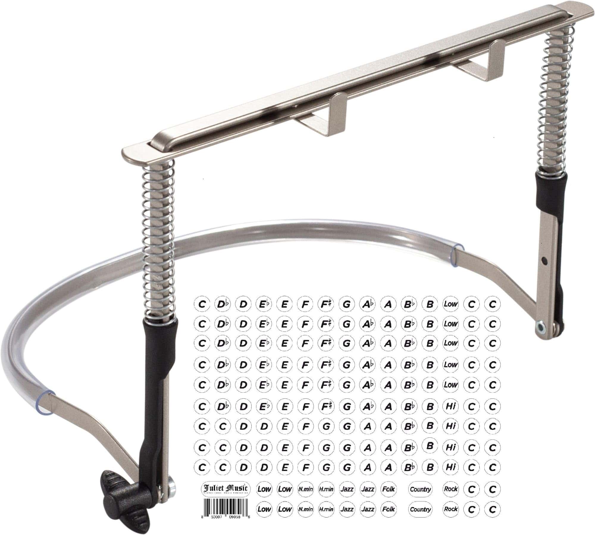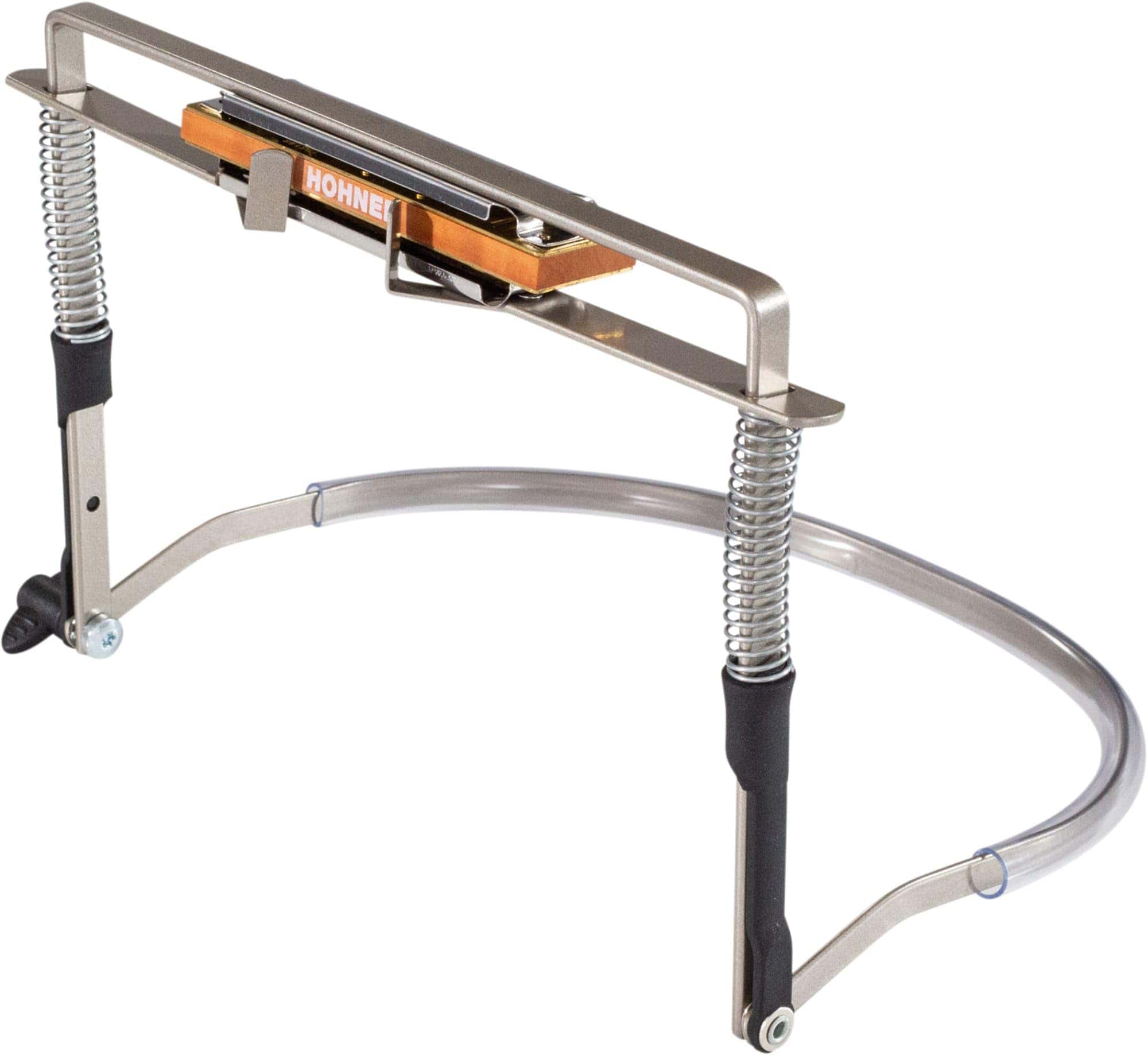 Puede sujetarse a una variedad de tamaños de armónica de hasta 7.3 pulgadas (18.5 cm) incluyendo la armónica azul conocida como blue harp de diez agujeros.