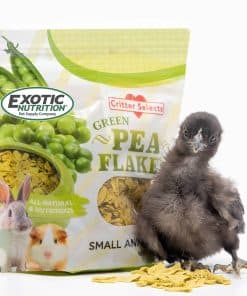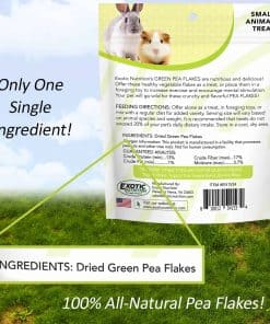 Exotic Nutrition Pea Flakes son un saludable y natural treat para pequeñas mascotas como Chinchillas, Perros de la Pradera, Cobayos, Planeadores del Azúcar, Degús, Zorrillos, Gallinas de Patio, Conejos y otras mascotas. TAMAÑO: 1 lb. CARACTERÍSTICAS: SALUDABLE – Alimento suplementario rico en vitaminas. VERSÁTIL – puede ser ofrecido como un treat o mezclado en la comida de tus mascotas. SEGURA – fácil de digerir ya que la textura del guisante se descompone durante el proceso de aplanamiento. NUTRITIVO – contiene minerales y aminoácidos vitales incluyendo lisina. VARIEDAD – Aporta variedad a una dieta monótona. ENTRENAMIENTO – Ayuda en el entrenamiento al permitirte recompensar a tu mascota. CREAR VÍNCULO – Forma una conexión entre las mascotas y los dueños. INGREDIENTES: guisantes verdes ANÁLISIS GARANTIZADO: proteína 13% (min), grasa 1% (max), fibra 17% (min) NOTA: Las hojas de guisante son muy frágiles y propensas a romperse. Las bolsas son manipuladas con el mayor cuidado y empaquetadas cuidadosamente, pero desafortunadamente no hay forma de empacar/enviar un producto como este sin la posibilidad de algún desgaste.