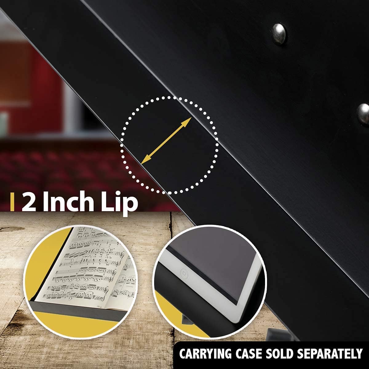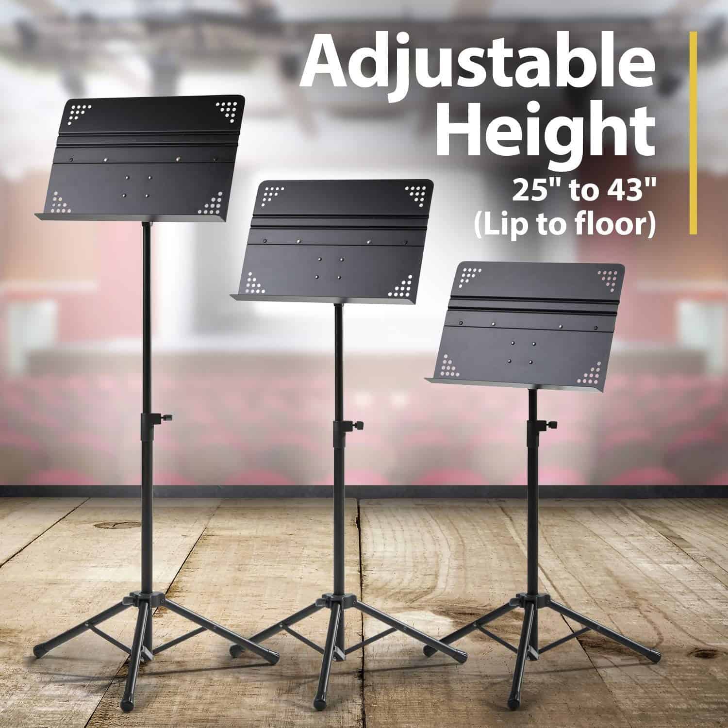 1. Construcción profesional resistente garantizada. Fácil de transportar y se pliega completamente para guardar. 2. Construcción profesional resistente garantizada. Fácil de transportar y se pliega completamente para guardar. 3. El atril mide 13.5″ por 18.75″ con un borde de 2″ y bordes enrollados para mayor seguridad y resistencia. 4. Ajuste de altura de 25″ a 43″ (borde al suelo) para usar sentado o de pie. Altura máxima total es de 55″. 5. Perilla de ajuste de ángulo para inclinación fácil. 6. Perillas, cabeza de tornillo, carcasa de pata y tapas de extremo de pata están hechos de material de nylon reforzado.