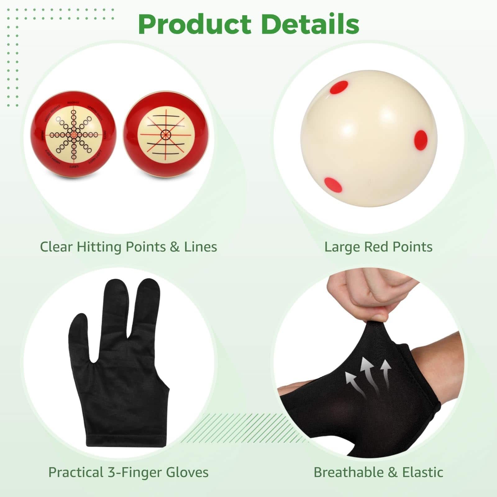 1. Material de Resina Confiable: Experimenta la longevidad con nuestra bola de billar elaborada con resina de calidad; superficie brillante y resistente al desgaste; soporta impactos sin esfuerzo; el billar garantiza un uso prolongado sin perder encanto o función. 2. Diseño de Doble Color Elegante: Admira los deslumbrantes tonos rojo y marfil de nuestras bolas de billar; diseñadas para mejorar el atractivo visual y el estilo elevado del juego; no son un accesorio común, elevan tu conjunto de mesa de pool a nuevas alturas. 3. Portabilidad Conveniente: Disfruta de una gran comodidad con dos bolsas de almacenamiento con cordón; bolas de billar para mesa de pool que transportan sin esfuerzo tus tacos y accesorios de pool; diseño elegante y compacto para almacenamiento sobre la marcha; no más desorden o desorganización. 4. Control de Bola Mejorado: Domina tu juego con precisión utilizando la bola de entrenamiento designada para el punto de impacto; diseñada para un control y precisión superiores; la bola de entrenamiento de taco es ideal tanto para jugadores profesionales como para entusiastas ansiosos por perfeccionar sus habilidades. 5. Set Completo para Jugar: Prepárate para la acción con un par de guantes de billar y 12 pegatinas de posicionamiento; bolas de billar de pool gran equipo para mejorar la experiencia de juego; bola de entrenamiento de taco adecuada para varios niveles de habilidad; asegura que estés siempre equipado para el juego
