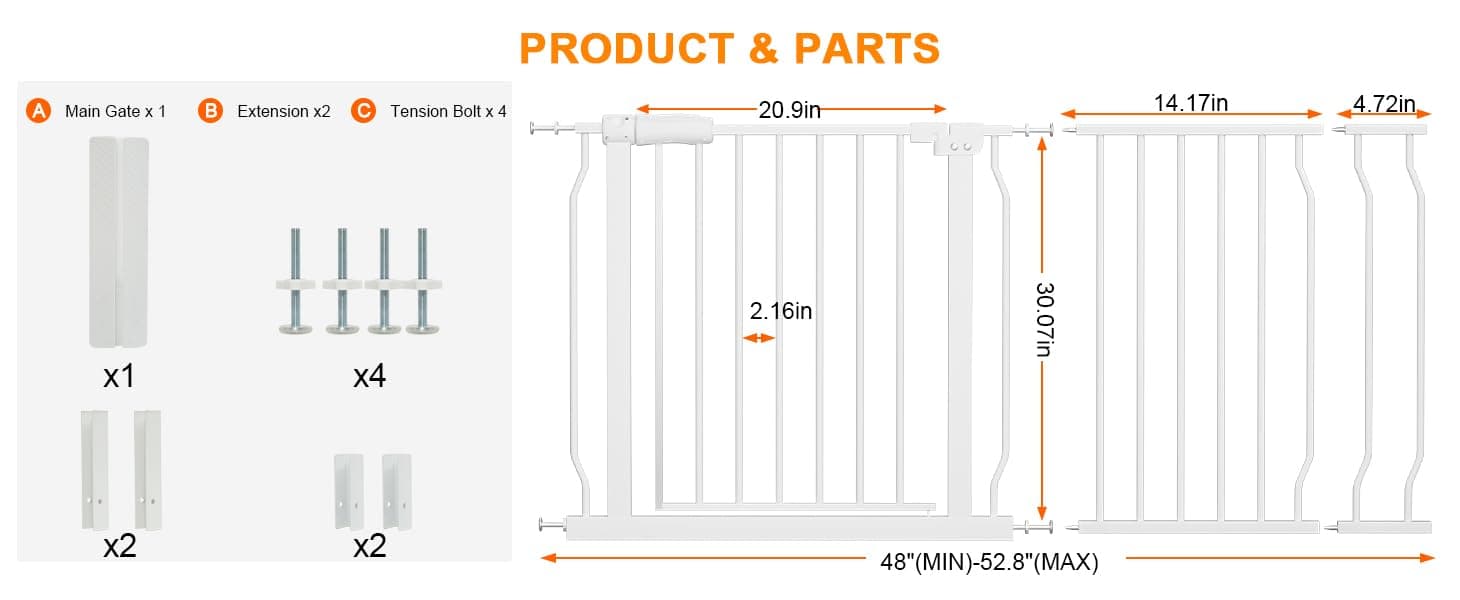 Montaje Diseño: Nuestras barreras de seguridad para bebés utilizan un sistema de doble bloqueo para limitar el acceso de los niños o mascotas y mantenerlos seguros. Los adultos pueden levantar fácilmente la manija con una mano pero es difícil para los niños. Esta barrera de bebé se cerrará automáticamente cuando se suelte la manija. El diseño de doble cara le permite abrir en cualquier dirección. Tiene una altura de 30 pulgadas. La distancia de 2 pulgadas entre las barras verticales puede evitar que sus bebés y mascotas se escapen o se atoren la cabeza. Variedad de Opciones de Ancho para Elegir: Nuestra barrera de seguridad para bebés tiene variedad de anchos para elegir: Diferentes tamaños con diferentes paneles de extensión, todos los tamaños se pueden ajustar fácilmente, se adapta a espacios pequeños o amplios de 24 a 81 pulgadas. Por favor, mida cuidadosamente sus aberturas antes de comprar. Características de la Barrera de Seguridad HOOEN: Puerta de gran apertura que garantiza que los adultos pasen fácilmente Se adapta a aberturas estrechas a anchas entre 24-81 Doble cara y cierre automático Operación con una sola mano con función de presionar y levantar Fácil instalación montada a presión sin herramientas para proteger la pared Construcción resistente y de metal pesado Fácil Instalación: Esta barrera de bebé montada a presión es súper fácil y rápida de instalar y quitar. Lo único que necesita hacer es ajustar los 4 ejes independientemente a la pared. Si elige el tamaño con paneles de extensión, es muy simple de añadirlos. Simplemente use los tornillos que aseguran la puerta en el extremo exterior de la extensión y pégalos en la puerta hasta que estén bien apretados. MULTIFUNCIONAL: Adecuado para escaleras, pasillos, puertas, cocina, salas de estar y cualquier espacio abierto al aire libre.
