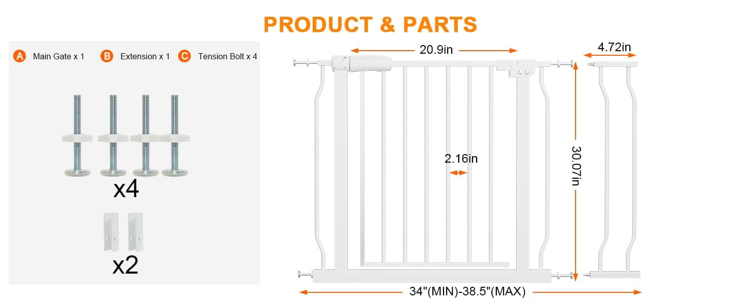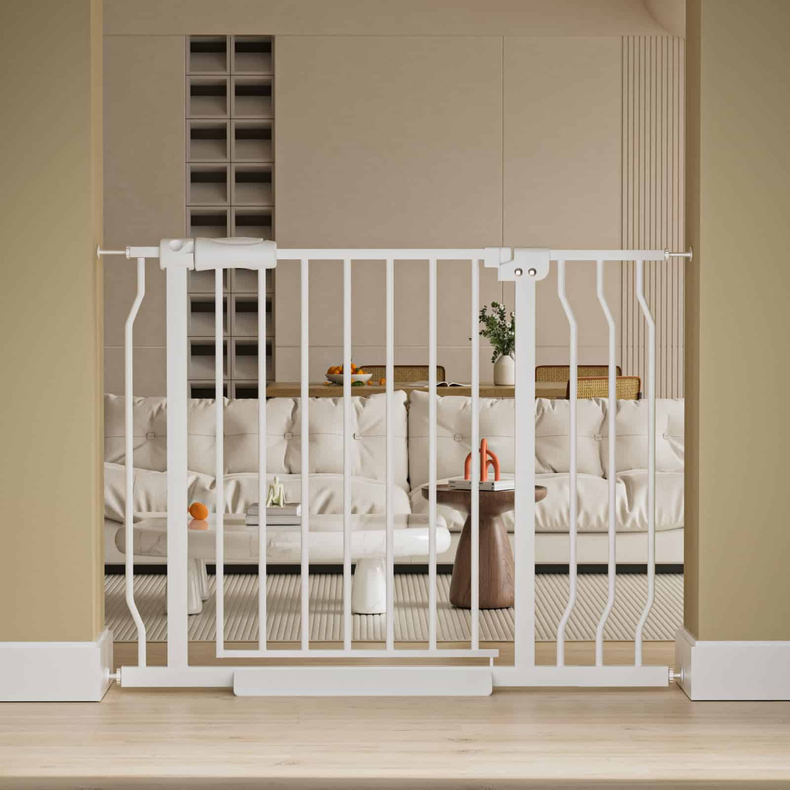 Diseño montado bajo presión: Nuestras puertas para bebés utilizan un sistema de doble bloqueo para limitar el acceso de niños o mascotas y mantenerlos seguros. Los adultos pueden levantar fácilmente la manija con una mano pero es difícil para los niños. Esta puerta para bebés se cerrará automáticamente cuando se suelte la manija. El diseño de doble cara le permite abrirla en cualquier dirección. Tiene 30 pulgadas de alto. La distancia de 2 pulgadas entre las barras verticales puede evitar que sus bebés y mascotas se salgan o se les quede atrapada la cabeza. Variedad de opciones de ancho para elegir: Nuestra puerta de seguridad para bebés tiene una variedad de anchos para elegir: Diferentes tamaños con paneles de extensión diferentes, todos los tamaños se pueden ajustar fácilmente, se adapta a espacios pequeños o anchos de 24 a 81 pulgadas. Por favor, mida cuidadosamente sus aberturas antes de comprar. Características de la puerta para niños de seguridad HOOOEN: La puerta oscilante ancha puede asegurar que los adultos pasen fácilmente Se adapta a aberturas estrechas o anchas de 24 a 81 Doble cara y auto cerrado Operación con una mano con función de presionar y levantar Fácil instalación montada bajo presión sin herramientas para proteger la pared Estructura metálica resistente y de alta resistencia Fácil Instalación: Esta puerta de seguridad montada bajo presión es súper fácil y rápida de instalar y quitar. Lo único que necesitas hacer es ajustar los 4 varillas de espiga independientemente en la pared. Si eliges el tamaño con paneles de extensión, es muy simple agregarlos. Solo usa los tornillos que aseguran la puerta en el extremo exterior de la extensión y empújalos hasta que estén bien apretados. MULTIFUNCIONES: Adecuado para escaleras, pasillos, puertas, cocina, salas de estar y cualquier espacio abierto al aire libre.