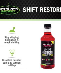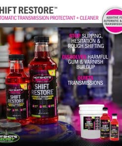 La fórmula de Shift Restore funciona disolviendo barnices y residuos de aditivos dentro de su transmisión para eliminar la esticción y reducir su coeficiente de fricción. Además de proporcionar protección contra el desgaste y prevención del óxido, se ha demostrado que esta fórmula mejora su economía de combustible. Reduzca el desgaste de la transmisión, los cambios irregulares e inconsistentes, la vacilación y el funcionamiento brusco, ruido y vibración cuando elige tratar vehículos con Hot Shot’s Secret Restore Transmisión Automática.
