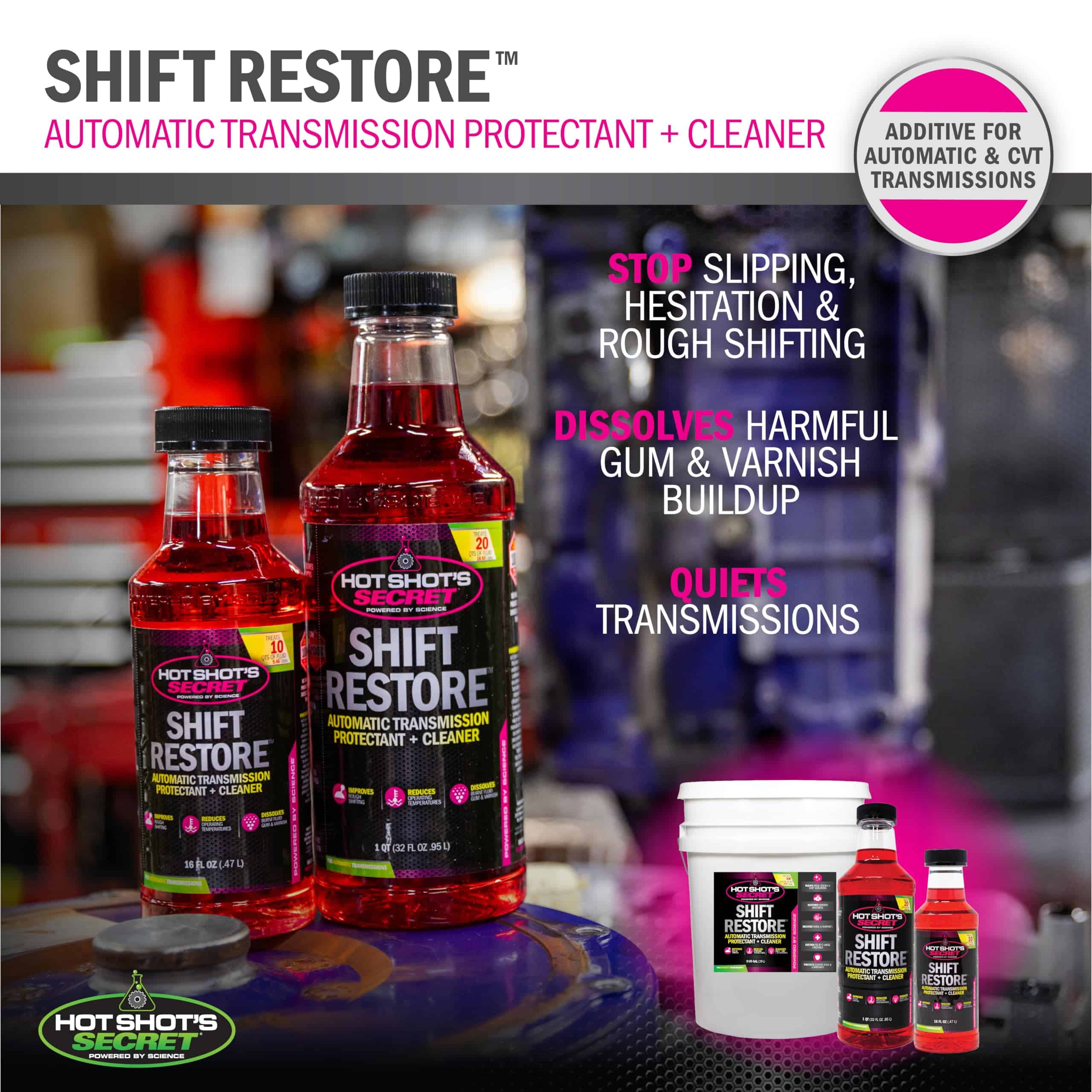 Anteriormente conocido como Eliminador de Esticción de Transmisión, o Fluidos de Transmisión TSE, el Aditivo para Transmisión Automática Hot Shot’s Secret Shift Restore fue diseñado para satisfacer las demandas en constante evolución de sistemas de transmisión sofisticados. Esta fórmula de alto rendimiento de ésteres es un agente de lubricidad y limpieza único que se adhiere tenazmente a todas las partes metálicas con las que entra en contacto dentro de la transmisión. La fuerte polaridad elimina los depósitos de las superficies metálicas y los vuelve a solución. El metal en una transmisión casi siempre está cargado positivamente mientras que Shift Restore está cargado negativamente. La adhesión de una fina capa de Shift Restore a todos los metales es natural y no depende de la temperatura, presión o cualquier otra cosa. Un beneficio adicional es una reducción de la temperatura debido a menos fricción en las piezas móviles críticas.