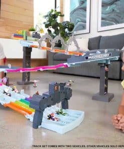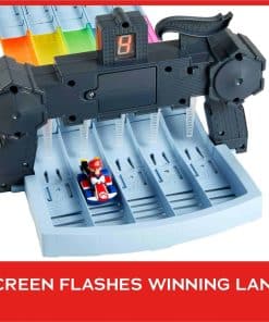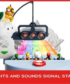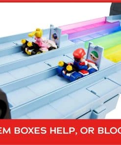 ¡Hot Wheels y Mario Kart traen a la vida un nivel de videojuego dramático con el curso final e icónico de la franquicia, Rainbow Road! La pista de 8 pies de largo tiene cinco carriles de carreras translúcidos de colores del arco iris que se pueden configurar rectos o curvados. Los niños pueden usar la puerta de inicio electrónica para competir con hasta cinco karts de escala 1:64 favoritos de Mario Kart. El set de pistas viene con dos vehículos: un King Boo exclusivo y Mario. ¡Una vez que los karts empiezan a competir, pueden enfrentarse a curvas inclinadas o una carretera ondulada y deben pasar por el aleatorizador de caja de artículos para ganar! Luces y sonidos anuncian al ganador en la puerta de llegada. ¡Es un gran regalo para niños de 4 años en adelante, especialmente para los fans de Mario Kart! Los colores y decoraciones pueden variar.