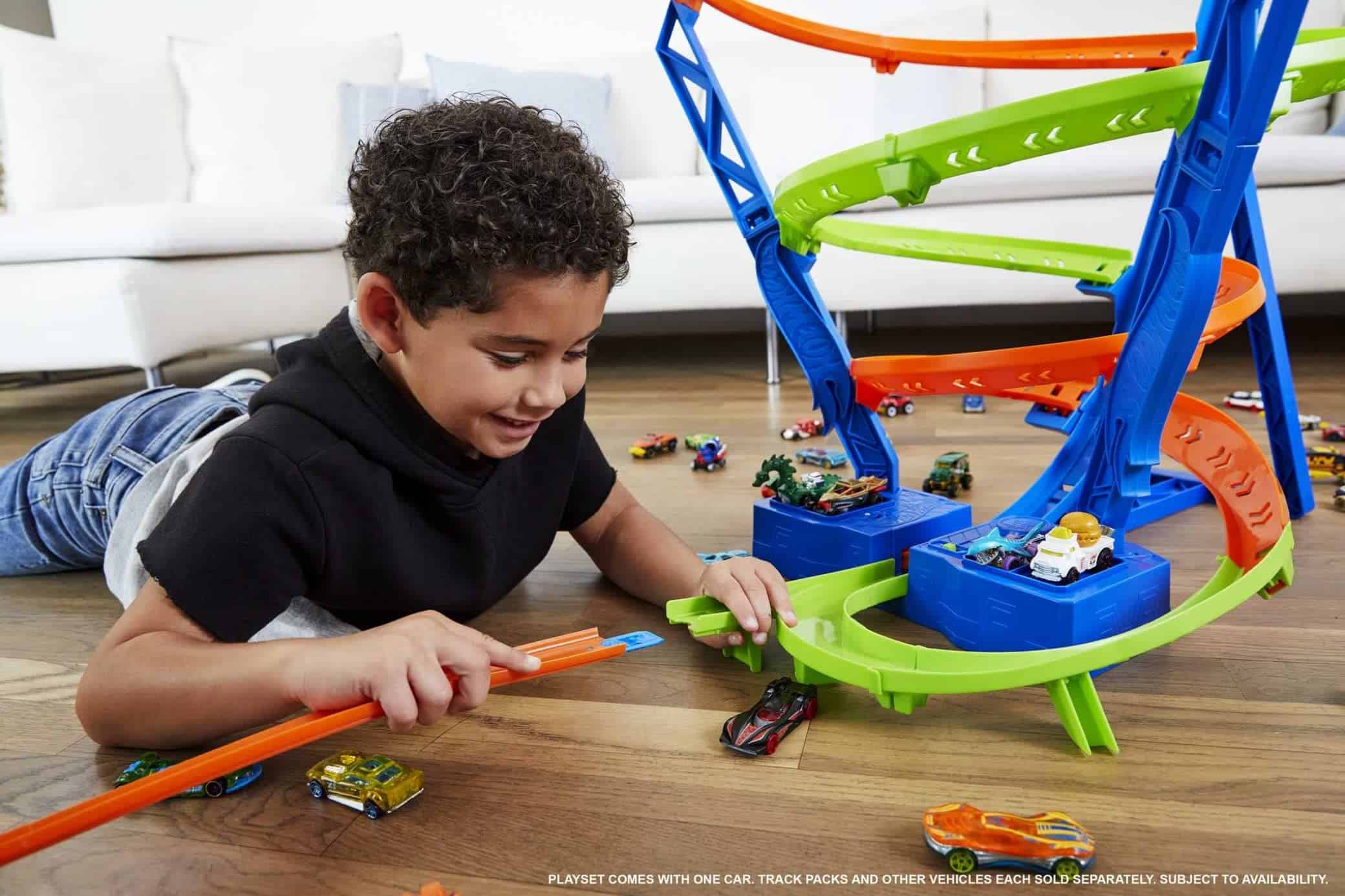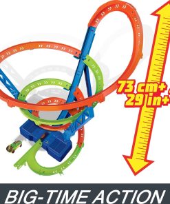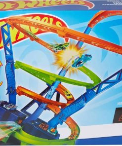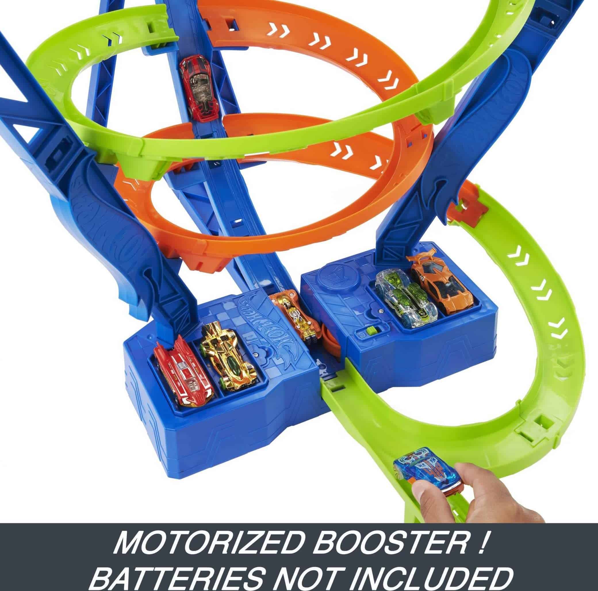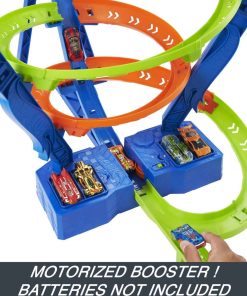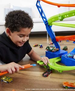 El Hot Wheels Action Spiral Speed Crash Track Set ofrece emociones de gran tamaño con una pista de 29 pulgadas de alto, tres zonas de choque y un potenciador motorizado que mantiene el coche en movimiento. Conduce el vehículo Hot Wheels incluido hasta el potenciador y mira cómo baja continuamente por la espiral. Para aumentar el desafío, agrega coches adicionales hasta que haya un inevitable choque en una de las zonas de choque. Almacena hasta 6 coches sobre la caja de batería y el potenciador. Coches adicionales se venden por separado. Los colores y decoraciones pueden variar.