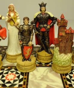 Este listado es para un juego nuevo de ajedrez de 32 piezas pintadas a mano con tablero. Las piezas están construidas en resina sólida, pintadas a mano y tienen bases de fieltro. El tablero presenta un diseño de mosaico artificial sobre un núcleo de madera mdf sólida. Tablero: 14 3/8″ x 14 3/8″ x 1/2″ de grosor. Superficie de juego: 12 1/2″ x 12 1/2″ Cuadrados de juego: 1.56″ Lado rojo: Rey: 3 1/4″ – Rey Arturo Reina: 3 1/8″ – Ginebra Alfil: 2 7/8″ – Merlín Caballero: 2 7/8″ – Passelande Torre: 2 3/4″ – Castillo de Lot Peón: 2 5/8″ – Sir Lancelot Lado azul Rey: 3 1/4″ – Rey Lot Reina: 3 1/8″ – Morgan Le Fay Alfil: 2 7/8″ – Mordred Caballero: 2 7/8″ – Caballo de Lot Torre: 2 3/4″ – Camelot Peón: 2 5/8″ – Melehan Diámetro de base: 1″ Peso total de las piezas: – 1.75 libras Las piezas vienen en una caja decorativa con almacenamiento de espuma.