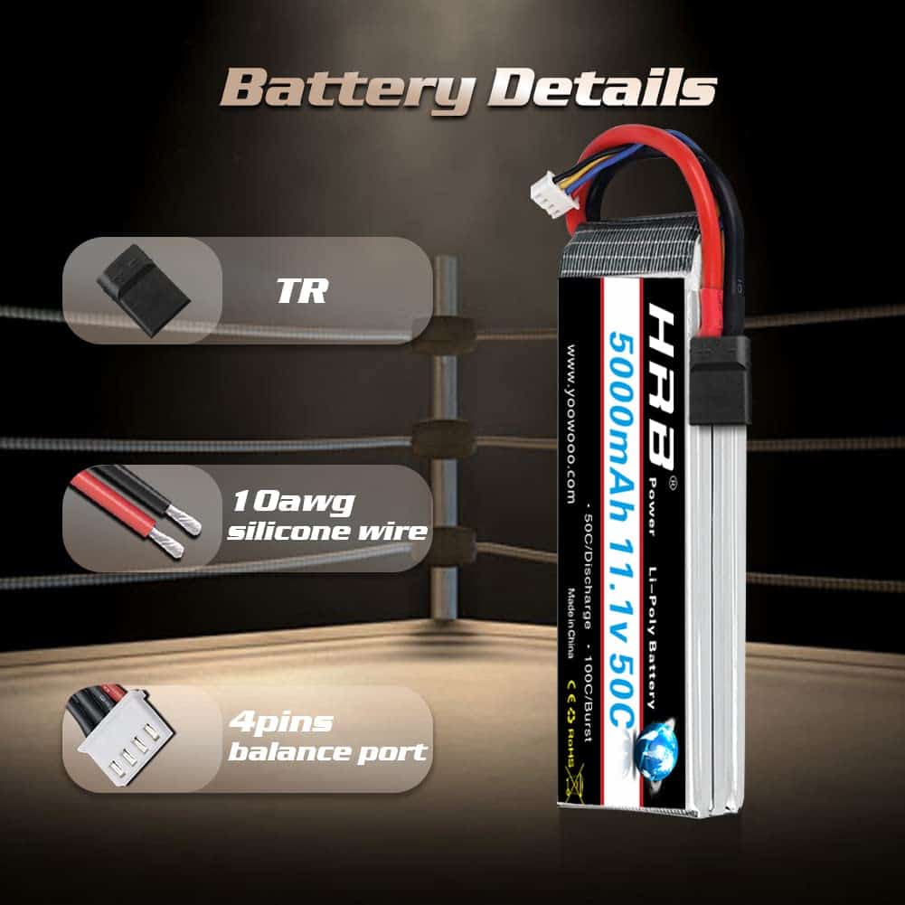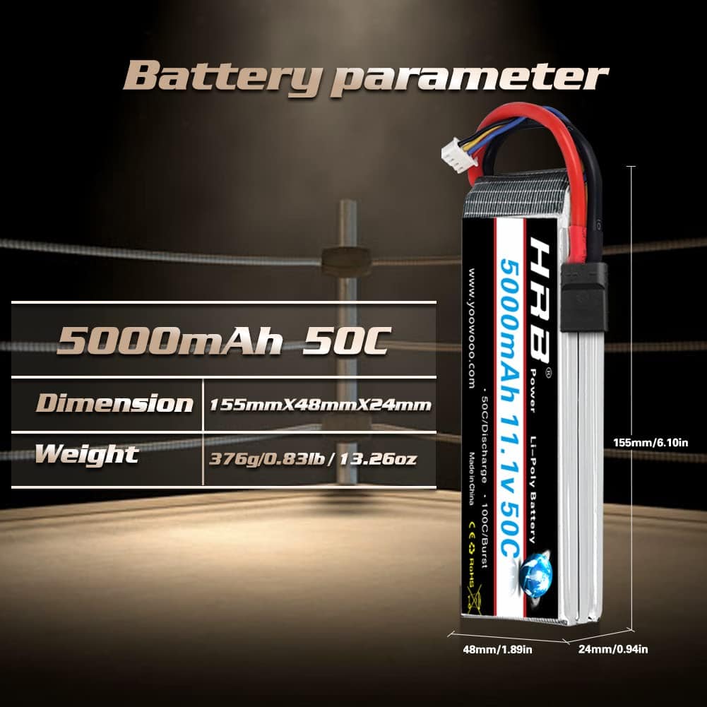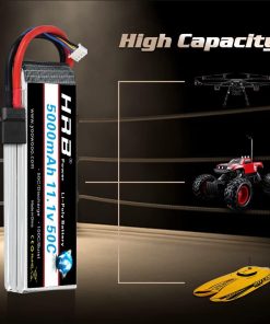 Capacidad: 5000mAh Tasa de descarga continua: 50C Tasa de ráfaga: 100C Voltaje: 11.1V Celdas: 3S Conector de Equilibrado: JST-XH Tipo de Conector: Conector Traxxas Dimensión: 6.1 1.89 0.91in / 155 mm 48mm 23mm (diferencia de 0 – 3mm) Peso: 14.25oz/404 2g Contenido del embalaje 100% Nuevo 1x batería 11.1v 5000mah 50c Resumen HRB es la primera marca de baterías en el mundo que se enfoca únicamente en suministrar energía para drones, UAV, UAS y productos FPV. Dedicada a proporcionar una mejor experiencia de vuelo. HRB ha estado poniendo grandes esfuerzos en la investigación y desarrollo tecnológico y ahora se ha convertido en la marca de baterías UAV más famosa y profesional del mundo. Atención 1.Para la batería RC, solo si el voltaje y el conector coinciden, entonces encajará. 2.No sobrecargue más de 4.2V y no descargue por debajo de 3.7V. 3.No lo coloque cerca de condiciones de alta temperatura. 4.No lo tire al fuego y al agua. 5.Revise cuidadosamente la condición de la batería antes de usar o cargar. 6.Si la nueva batería no retiene una carga completa o pierde la carga muy rápidamente en poco tiempo, por favor use un Cargador de Equilibrio para cargar y reciclar varias veces primero.
