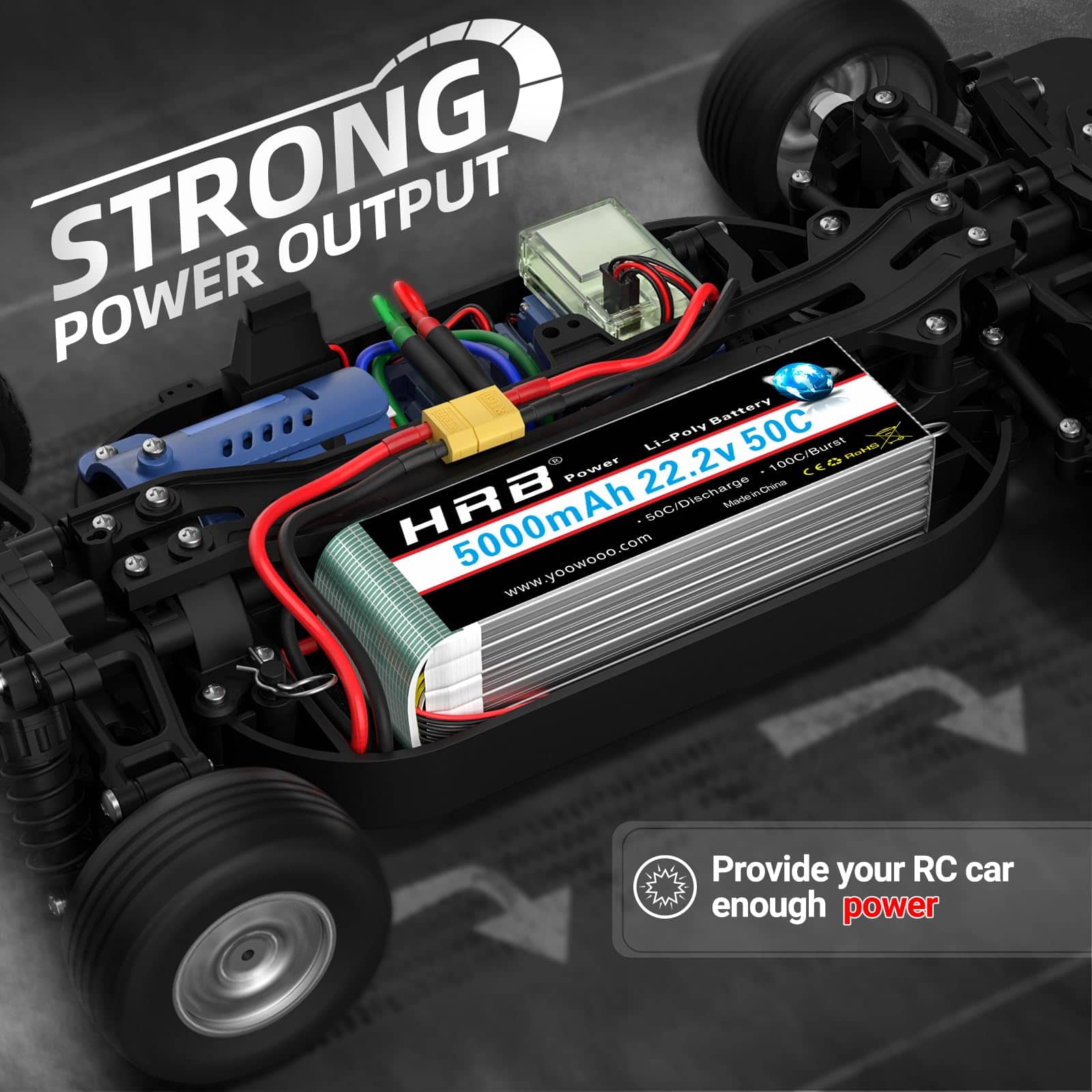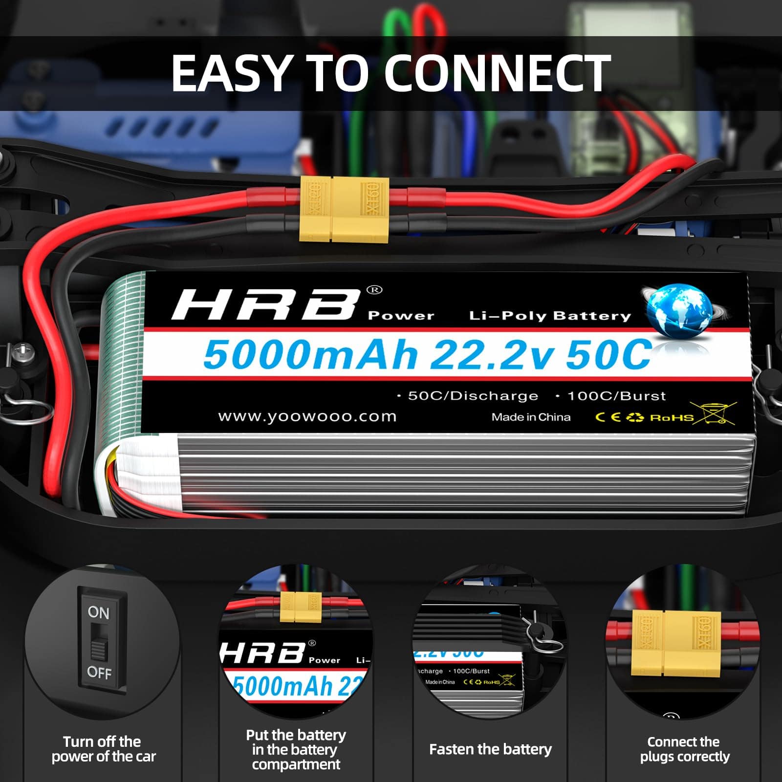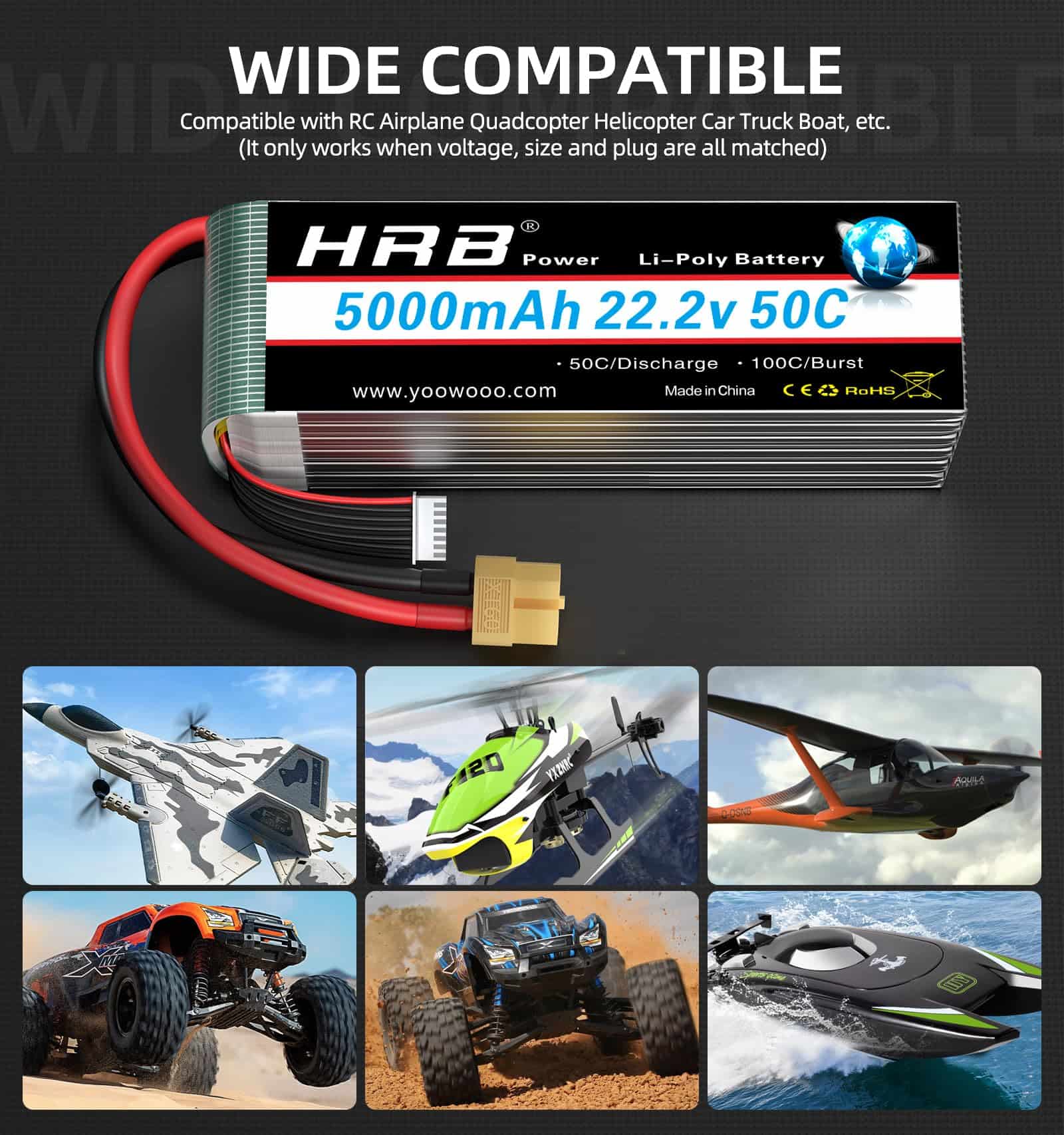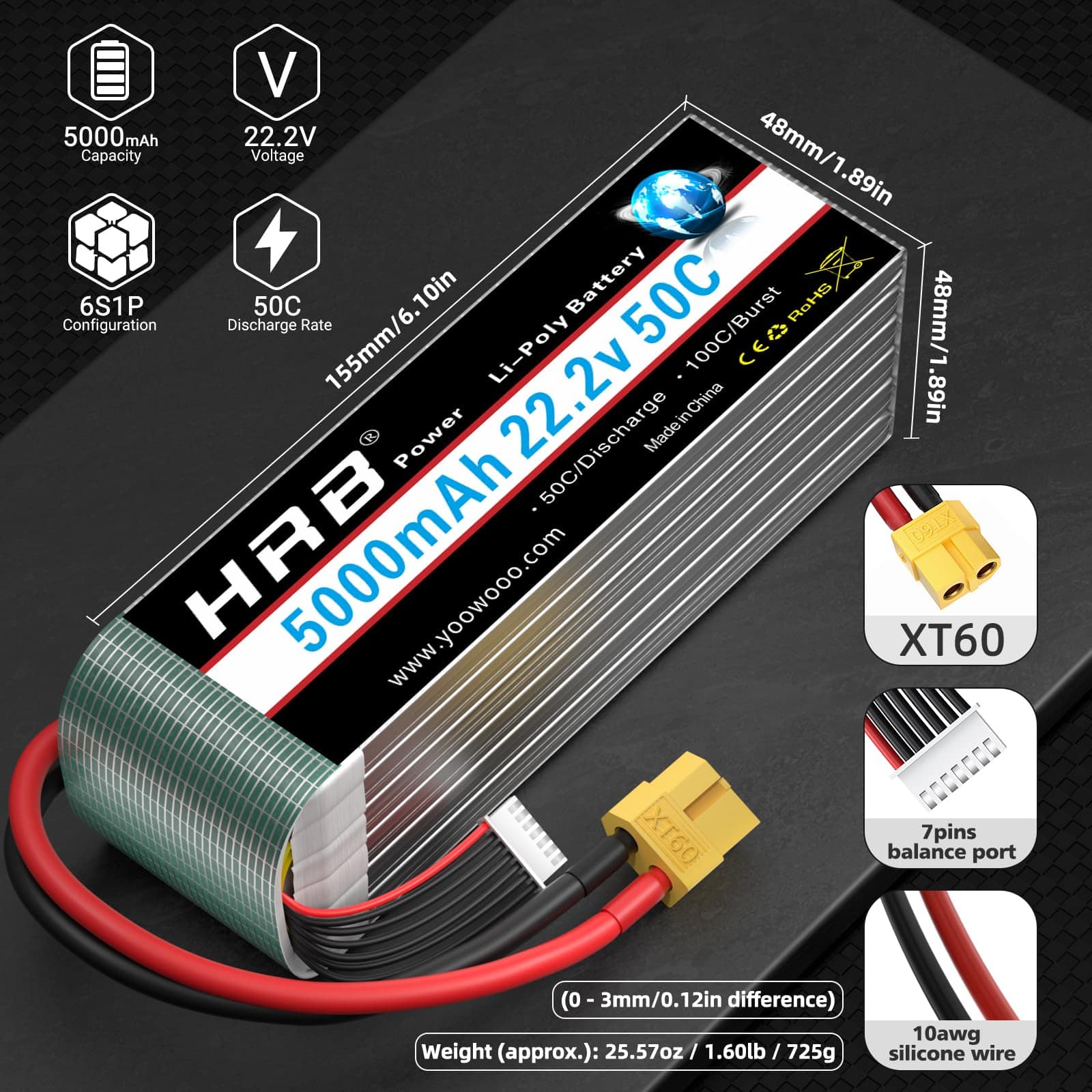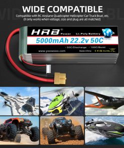 Capacidad: 5000mAh. Tasa de descarga continua: 50C. Tasa de ráfaga: 100C. Voltaje: 22.2V. Celdas: 6S. Conector de balance: JST-XH. Tamaño: 6.1 1.89 1.81 pulg. Peso: 26.56oz / 753g. HRB es una marca de baterías enfocada en drones, UAV y productos FPV. Advertencia: Solo funcionará si el voltaje y el conector coinciden. No sobrecargar por encima de 4.2V o descargar por debajo de 3.7V. No exponer a altas temperaturas. No exponer al fuego o al agua. Verificar la condición de la batería antes de usar. Si la batería no retiene la carga, usar un cargador Balance Charger. Modelos de RC compatibles: Align T-REX 550, 700E, 700L, 800E, E-flite Beast 60e, CZ P2 Prometheus, Carbon-Z Cub y T-28, Habu 32x DF, Flitework Red Bull Pilatus PC-6 Turbo Porter 86.6″, Hangar 9 Carden Edition 89″ Extra 300, F4U-1A Corsair 20cc, Inverza 62, Messerschmitt BF 109F-2 60″, P-47D-1 Thunderbolt 60″, Sbach 342 60″.