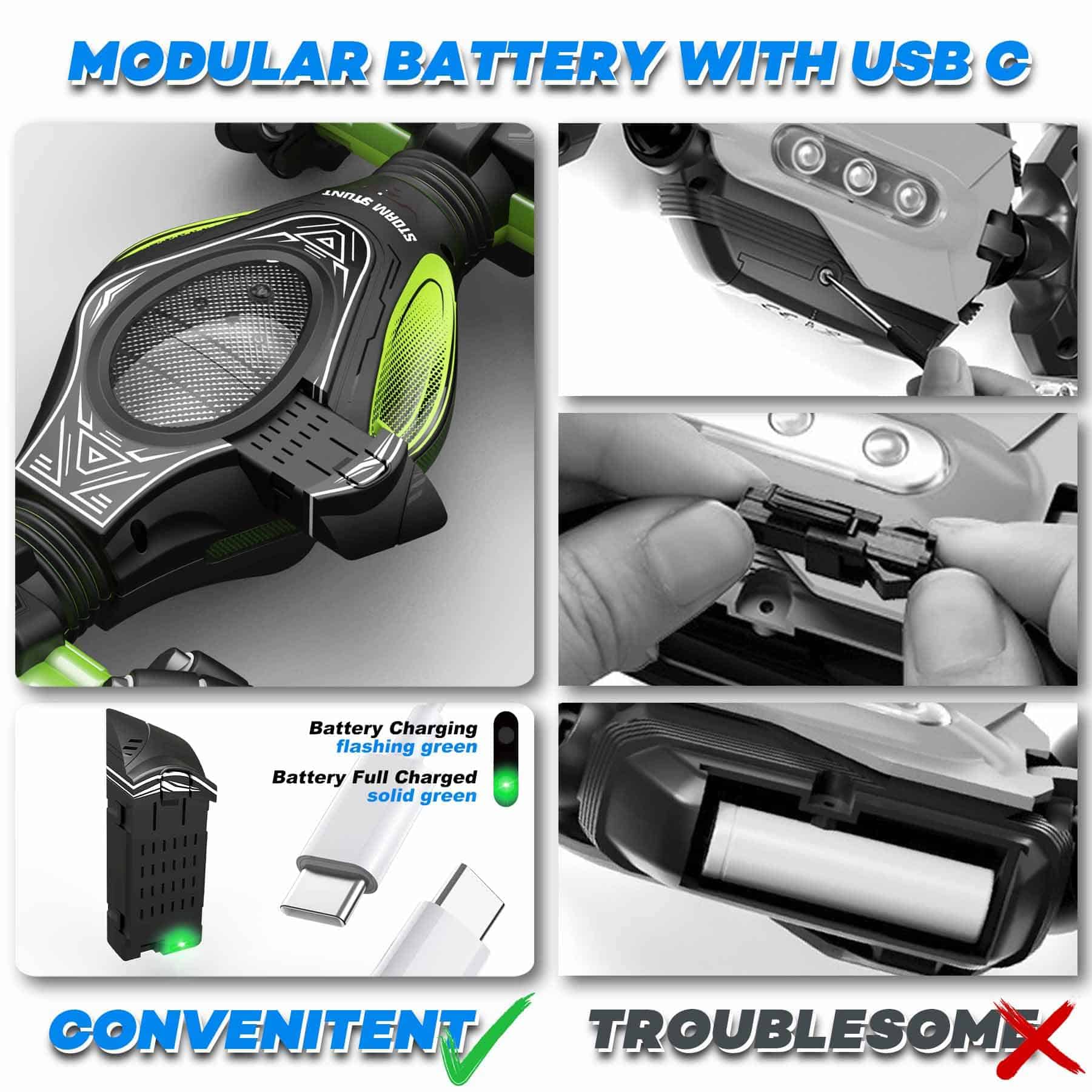 4. 2 baterías modulares para horas de diversión: El coche de acrobacias de detección de gestos está equipado con 2 pcs 7.4 500mAh baterías recargables para 60 minutos de tiempo de juego. Diseño de clip humanizado, Fácil de quitar la batería sin herramientas y carga rápida a través de USB. Además, la función de alarma de batería baja prolonga eficazmente la vida útil de la batería.