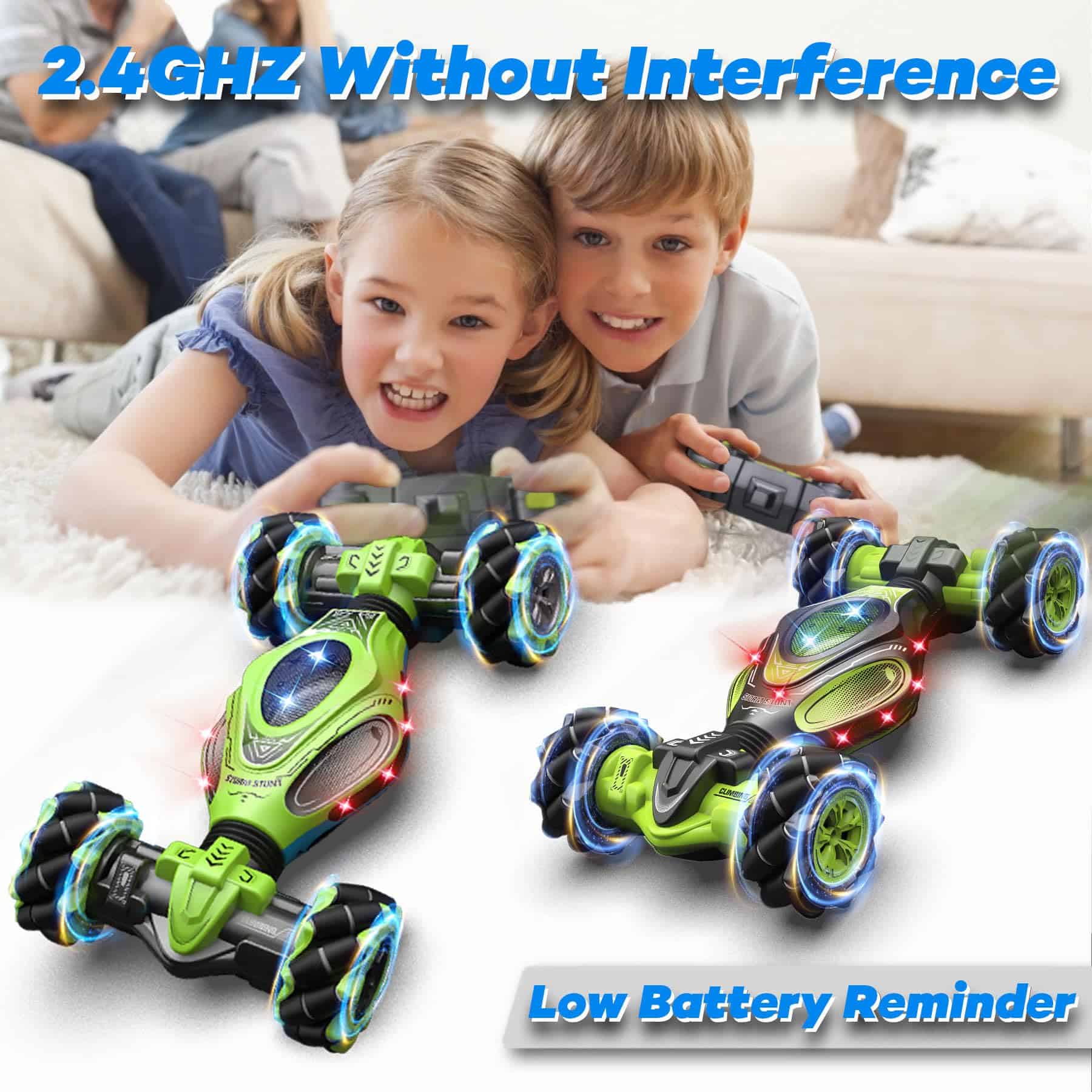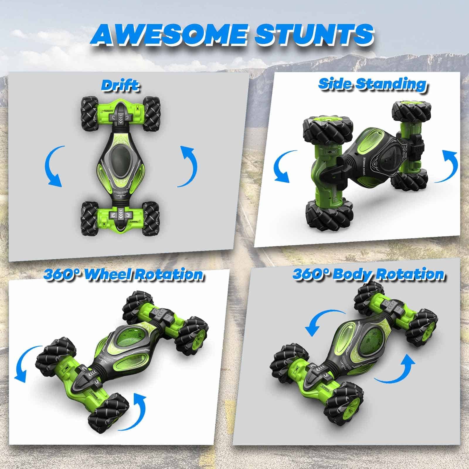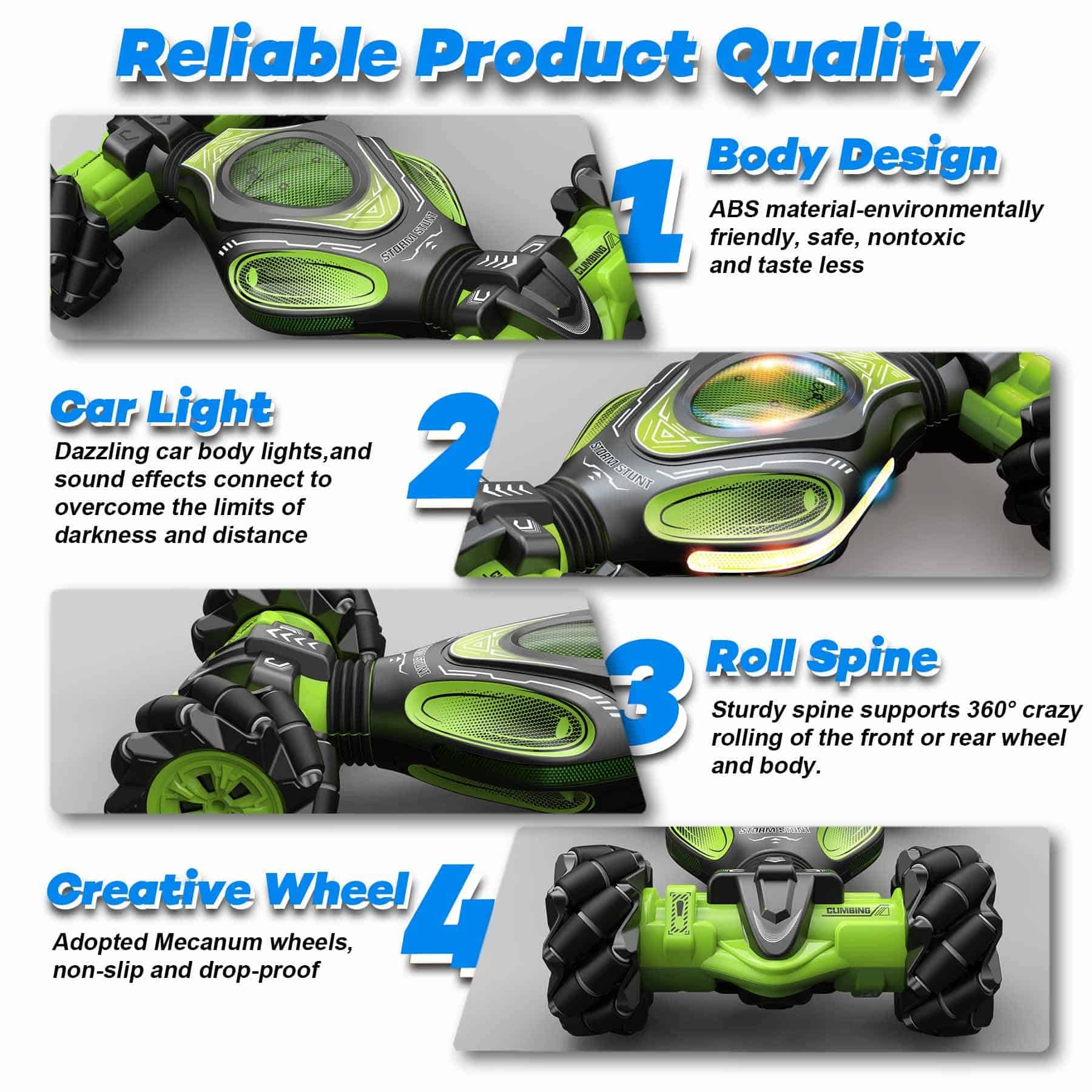 3. Soporte para carreras de automóviles juntos: Coches de acrobacias RC por gestos con tecnología anti-interferencias de 2.4Ghz soportan múltiples carreras de autos juntos. Destacados con motores potentes y neumáticos de tracción de rodillos, el auto control remoto puede superar fácilmente varios terrenos. Brinda a todos una excelente experiencia de carreras.
