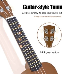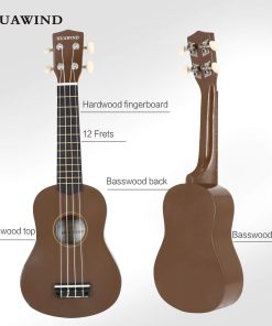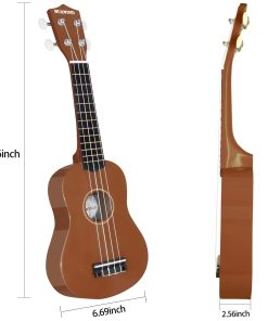 HUAWIND Ukelele Soprano de 21 Pulgadas para Principiantes, Hawaiian Ukelele de Cuatro Cuerdas de Madera Profesional para Adultos Estudiantes (Marrón). El ukelele soprano HUAWIND mide aproximadamente 21 pulgadas de extremo a extremo, lo que lo convierte en el ukelele más pequeño. Este es el tamaño tradicional para este instrumento, ofreciéndote ese sonido brillante clásico que esperas de un ukelele. Debido a su pequeño tamaño, no es extremadamente ruidoso y puede resultar complicado de tocar si tienes manos grandes. El cuerpo del ukelele está hecho de madera de tilo, que produce un sonido nítido y agradable. El puente de madera sólida y las clavijas de afinación de metal tienden a durar más tiempo. Tanto el cuerpo como las cuerdas son muy suaves, seguros y no dañarán tus dedos. El diapasón de madera dura cuenta con 12 trastes que permiten producir una gran cantidad de música genial. Las cuerdas de nylon y el diseño ecológico hacen que este ukelele se convierta en tu instrumento musical favorito. Con ocho colores diferentes para elegir, seguro encontrarás uno que te guste. Ya seas principiante o un tocador de ukelele experimentado, este ukelele es perfecto para ti. Los ukeleles son instrumentos hawaianos que se complementan perfectamente con la música hawaiana, pero puedes tocar cualquier tipo de música en este ukelele. Ya sea para ti o como regalo de Navidad, este ukelele para principiantes es una excelente elección. Su apariencia hermosa puede estimular tu interés por aprender a tocar. Este ukelele es un gran regalo para estudiantes y amigos. Además, cuentas con nuestra garantía de 60 días de devolución del dinero, 12 meses de garantía del vendedor contra defectos de fabricación a partir de la fecha de compra y nuestro servicio al cliente amigable las 24 horas. ¡Haz de la música una parte de tu vida con el ukelele soprano HUAWIND!