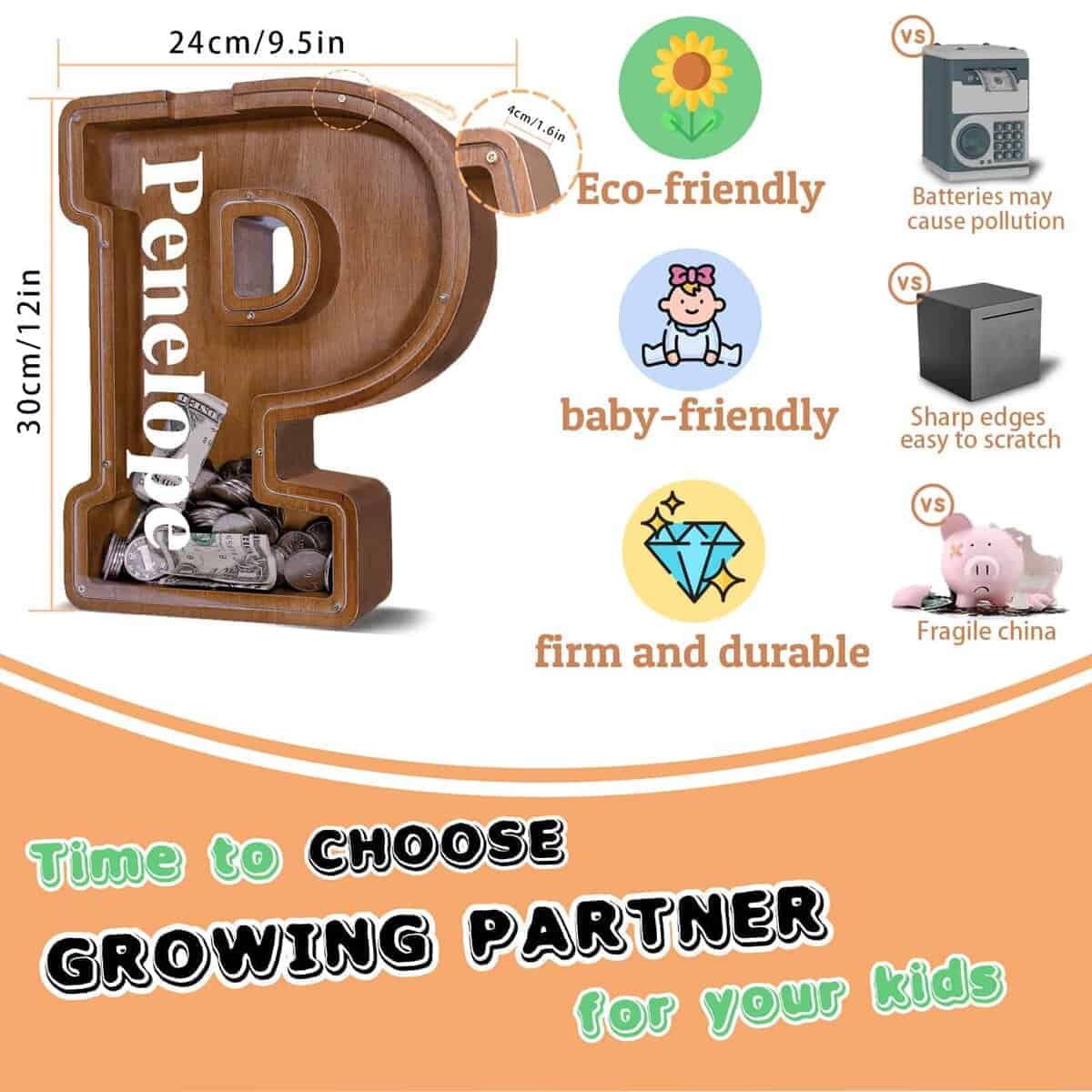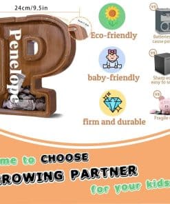 1. SEGURIDAD Y RESISTENCIA: Cada hucha de letra grande de madera está elaborada de una sola vez por una máquina CNC a partir de una madera de alta calidad, respetuosa con el medio ambiente y sostenible para un atractivo natural y duradero uso. La hucha de letra personalizada está meticulosamente pulida con diez rondas de máquina y dos rondas manuales para crear un toque suave y delicado. Tratada con aceite mineral y cera de abejas de grado alimenticio, sin pinturas ni tintes utilizados, es 100% segura, libre de toxinas y de formaldehído.