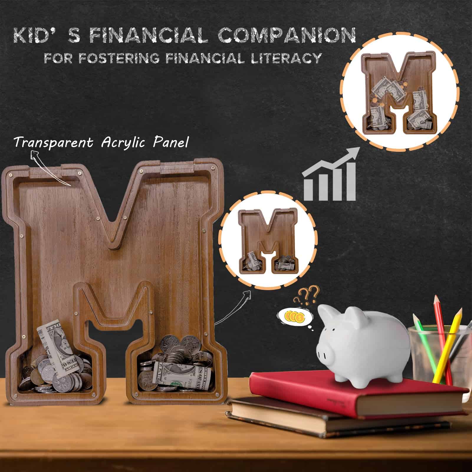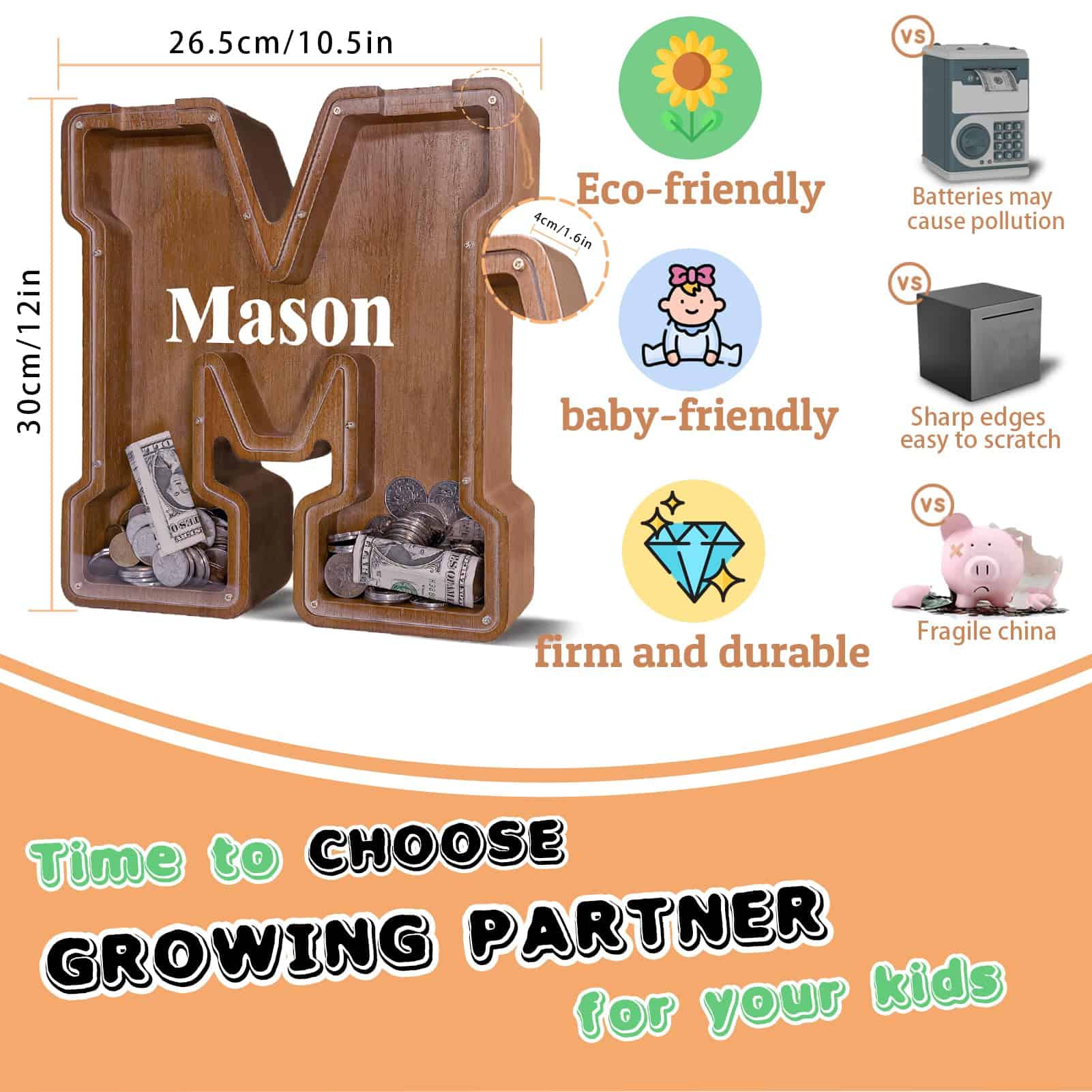 1. SAFETY AND STURDY: Cada gran alcancía de madera con letra está elaborada de una sola vez por una máquina CNC con madera ecológica y sostenible de primera calidad para un atractivo atemporal y natural, durabilidad y uso duradero. La hucha de letra personalizada está meticulosamente pulida con diez rondas de máquina y dos rondas manuales para crear un tacto suave y delicado. Tratado con aceite mineral de grado alimenticio y cera de abejas, no se utilizan pinturas ni tintes, es 100% seguro, libre de toxinas y libre de formaldehído. 2. KID’S FINANCIAL COMPANION: A través del panel de acrílico transparente de la alcancía de letra del alfabeto, los niños pueden monitorear fácilmente el crecimiento de los ahorros, haciendo un progreso tangible hacia sus objetivos. Desenrosque para acceder sin problemas a los ahorros, esta alcancía de monedas es un juguete educativo reutilizable prime para fomentar la educación financiera en los niños y promover una cultura de ahorro desde temprana edad. 3. REGALO ÚNICO Y PERSONALIZADO: Más allá de elegir una alcancía inicial con la inicial correspondiente para familiares o amigos, puede personalizarla aún más grabando mensajes únicos o nombres en la alcancía de madera personalizada. El panel de acrílico se puede adornar con dibujos exclusivos usando marcadores a base de agua. Un regalo perfecto para niños, recién nacidos, niños y niñas de cualquier edad, para Baby Shower, Día del Niño, Regreso a Clases, Día de Acción de Gracias, Navidad, Cumpleaños, etc. 4. CAJA DE ALMACENAMIENTO DECORATIVA VERSÁTIL Y MÁS GRANDE: La alcancía inicial se eleva a una altura de 12 pulgadas y cuenta con un grosor de 1 pulgada para una mayor capacidad, lo que le permite mantenerse estable en cualquier superficie. Su estructura resistente, hecha de materiales duraderos, combinada con una artesanía exquisita, la hace adecuada no solo como una alcancía de letras de madera, sino también como una decoración, caja de tarjetas de bodas, caja de embutidos o caja de bocadillos. 5. 100% SATISFACCIÓN: Estamos comprometidos a proporcionar productos de alta calidad, seguros y rentables. La satisfacción del cliente es nuestra misión. Si tiene alguna pregunta, no dude en contactarnos. Responderemos en un plazo de 12 horas y proporcionaremos la mejor solución posible.
