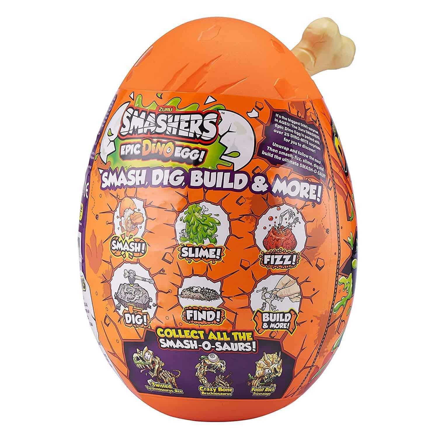¡Desbloquea más de 25 sorpresas dentro del huevo para construir el exclusivo Dino Smash-O-Saur! Utiliza el mapa de rascado para excavar el huevo y descubrir compuestos como la Fizzy Lava Bomb y el Putty de la Edad de Hielo con huesos ocultos del Smash-O-Saur. ¡Combina todos los huesos para empezar a construir uno de los 3 exclusivos Smash-O-Saurios! Dentro de cada Huevo de Dinosaurio Épico descubrirás más sorpresas como huevos Smash, herramientas de excavación y reconstrucción.
