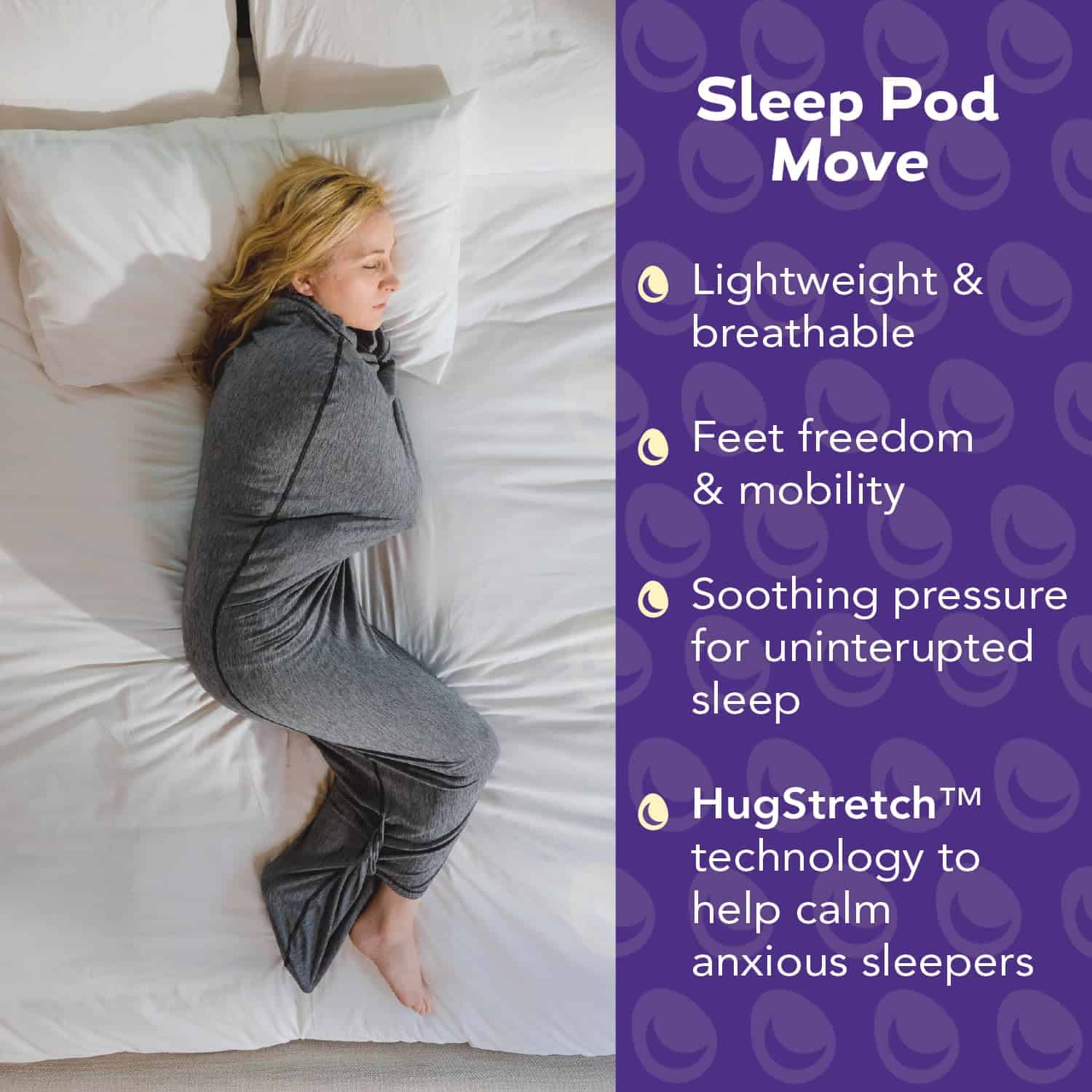 1. DISEÑO INNOVADOR DE SLEEP POD: ¡Experimenta la comodidad y el sueño definitivo con nuestra ingeniosa solución de sueño presentada en Shark Tank! La forma tipo cocoón de Sleep Pod cubre todo el cuerpo, aplicando una suave y calmante presión, como un abrazo, brindando comodidad y promoviendo la relajación para una buena noche de descanso. Y con el beneficio adicional de nuestro bolsillo para los pies, nuestro Sleep Pod Move proporcionará mayor movilidad y total libertad para los pies!. 2. MANTA REFRESCANTE PARA TODOS LOS DORMIANTES: Nuestra tecnología patentada HugStretch ofrece una transpirabilidad óptima y regulación natural de la temperatura corporal. Hecha de un material suave y elástico en 4 direcciones, esta manta acogedora te mantiene fresco y cómodo durante toda la noche. Adecuada para todas las posiciones de sueño, incluidas los que duermen de lado, boca arriba y más. Perfecta para niños, adolescentes y adultos de todas las alturas y tamaños de cuerpo. 3. ALTERNATIVA A LA MANTA PESADA: Experimenta una presión reconfortante sin el peso de las mantas ponderadas tradicionales con nuestro diseño patentado de envoltura que es transpirable, ligero y regulador de la temperatura para ayudar a garantizar un sueño profundo y rejuvenecedor. 4. BOLSILLO PARA LOS PIES PATENTADO MEJORADO: Esta manta también cuenta con un bolsillo para los pies para maximizar la comodidad y la flexibilidad. ¡Pisar, envolver, acurrucarse y dormir sin esfuerzo y ahora, levantarse rápidamente si es necesario!. 5. CUIDADO FÁCIL Y DURABILIDAD: Cada uno de nuestros Sleep Pods es lavable a máquina para un fácil cuidado y diseñado para la durabilidad. Te ayudarán a pasar de noches inquietas a sueños restauradores y vienen en un diseño apto para viajes que permite una fácil portabilidad. ¡Perfecto como regalos de cumpleaños para mujeres u hombres!