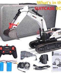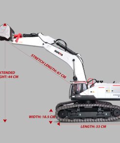 Nombre del producto: Huina 1594 excavadora RC; Color: Blanco; Tamaño del producto: 68.5 18.6 46.6CM; Dimensiones del paquete: 68 27.5 32.5CM; Batería recargable: 7.4V 2000 mAh de iones de litio; Tiempo de juego: 40-50 minutos por batería por carga completa; Distancia de control remoto: hasta 30 metros; Peso de la excavadora: 9.9 lb; Batería del control remoto: AA 3 (no incluida); Tiempo de carga: 5-7 horas; Control remoto: 2.4GHz, 22 canales