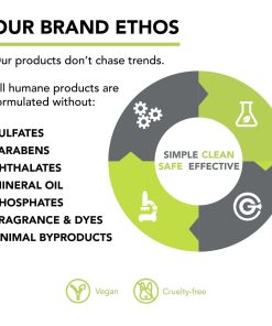Como miembro orgulloso del programa Beauty Without Bunnies de PETA, en Humane utilizamos ingredientes veganos y libres de crueldad para obtener resultados reales. Nuestros productos no contienen parabenos, ftalatos, sulfatos (SLS y SLES), parafina, formaldehído, aceite mineral, fragancia/color sintético, petrolato, DEA, triclosán o GMO. Todo fabricado en los EE. UU.