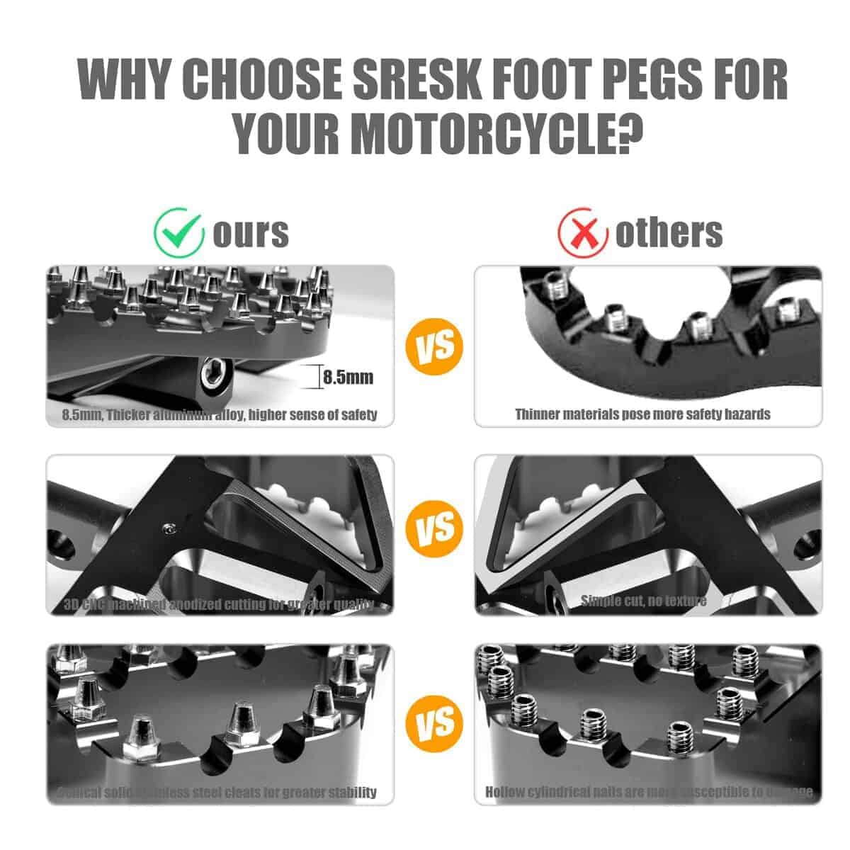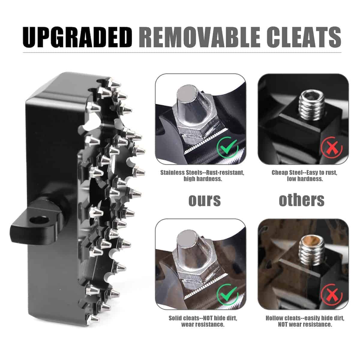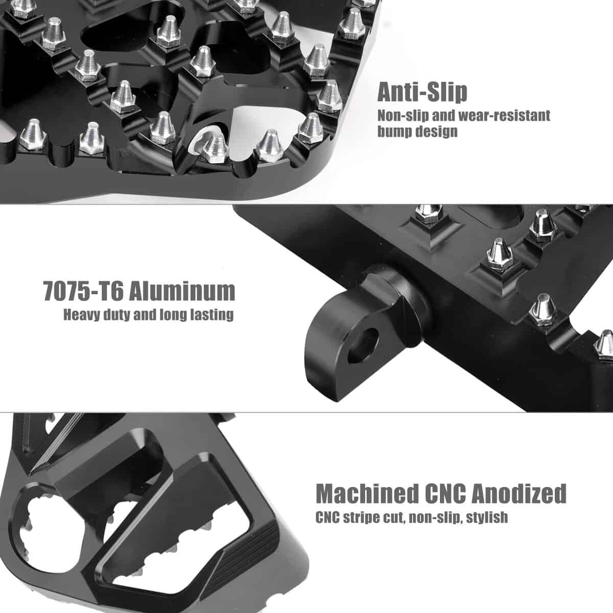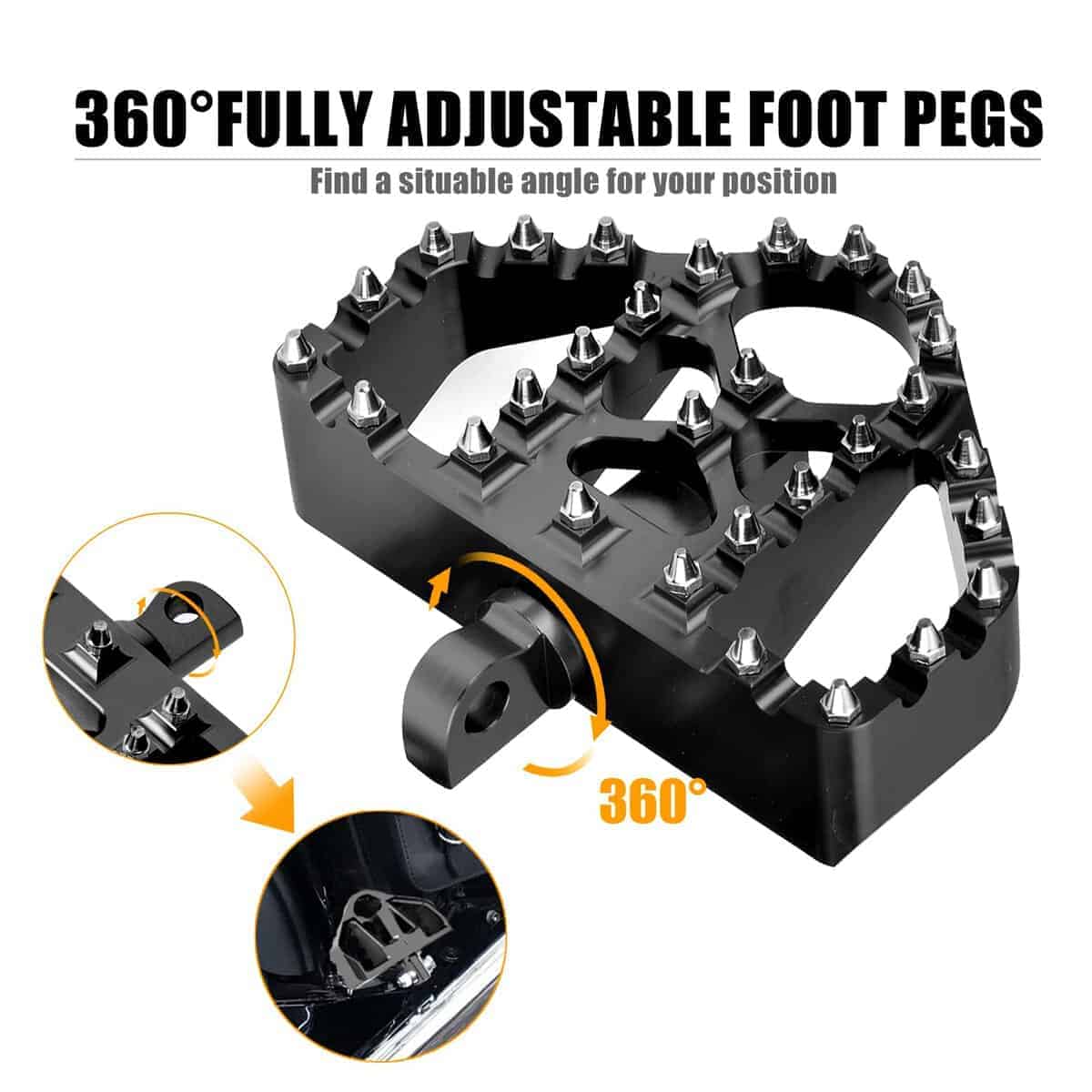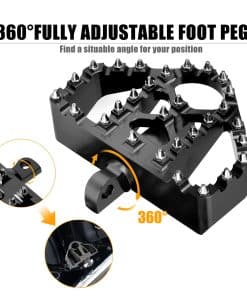 3. CONTROL DE DESLIZAMIENTO FUERTE Y AGARRES: Equipados con 17 clavijas extraíbles hechas de acero inoxidable resistente al calor de calidad aeroespacial, garantizando durabilidad incluso en condiciones adversas. Estas clavijas ofrecen un excelente agarre sin dañar las botas de motocross. El material de acero inoxidable proporciona un acabado pulido, evitando el óxido y manteniendo una apariencia brillante, mejorando tanto la funcionalidad como la estética.