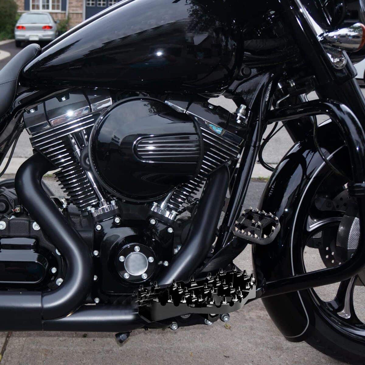 2. ROTACIÓN 360 Y PUENTE EN X: Nuestros Reposapiés de Harley cuentan con una versátil rotación de 360 grados, lo que le permite bloquearlos en su ángulo preferido. Controlado por 2 rodamientos de bolas y la detención perforada del reposapiés. Tenga cuidado de no perder los rodamientos de bolas durante la instalación. El Diseño de Estilo de Carreras MX, con un exclusivo puente «X» y 2 dientes centrales, mejora el agarre. El Diseño de Zapatilla Curvada se adapta a sus zapatos para una experiencia de control más cómoda y humanizada.